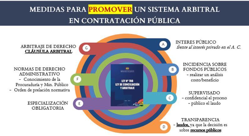 La Ley No. 708 se debe reformar y darle la facultad al ente público, a la máxima autoridad ejecutiva para que en sus documentos bases de contratación, en sus proyectos de contratos administrativos validados por el órgano rector, sea optativa la elección por la vía contenciosa o por la vía arbitral. No se debe olvidar que los organismos internacionales y entes financiadores plantean y pactan la cláusula arbitral (BID, CAF, etc.) y en nuestro país han financiado mega obras y han incorporado el arbitraje, aspecto que se debe asumir como una buena práctica.