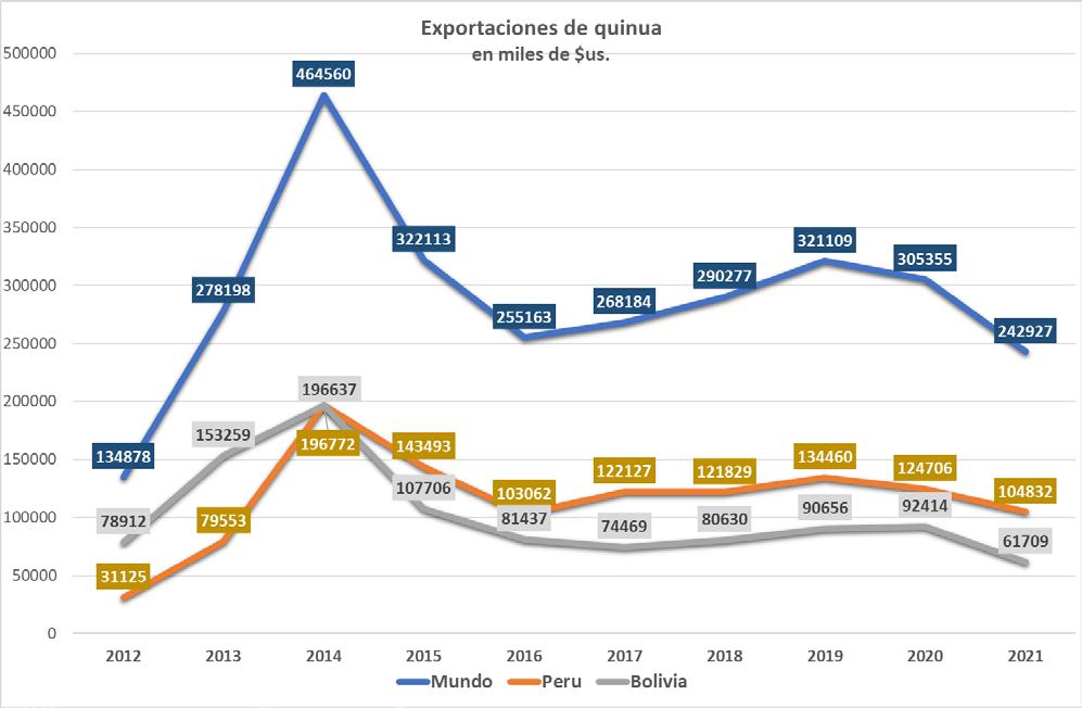 En segundo lugar, ha acelerado la producción de quinua en muchos países (a la fecha existen 66 países productores de quinua), que han entrado a ser competidores nuestros. Bolivia ha pasado de representar el 59% de las ventas mundiales de quinua el 2012, al 25% en 2021, mientras que el Perú era el 23% y en 2021 el 43%, con un monto exportado casi el doble que nosotros.