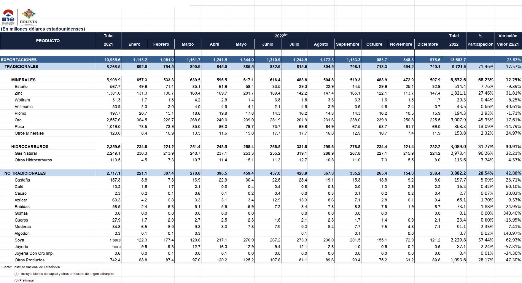25. Instituto Nacional de Estadísticas (INE) (2023). Bolivia: Exportación de Productos Tradicionales y no Tradicionales por mes 2009-2022.