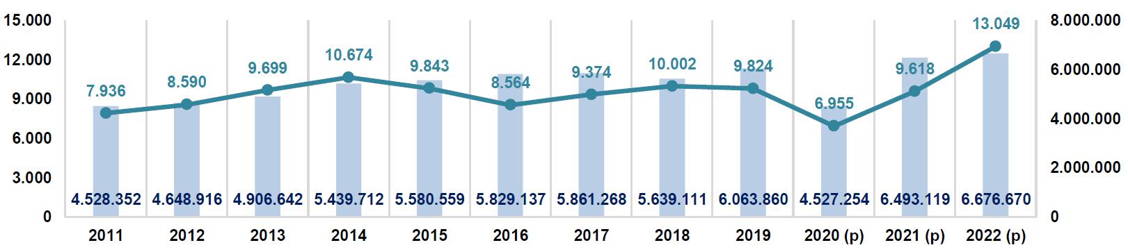 Exportaciones bolivianas 2011-2022 en millones de $us y TM