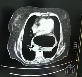 Durante la estancia, se solicita una tomografía de abdomen simple (figura1a, b, c) donde se reporta una hernia hiatal gigante, paraesofágica, vesícula aumentada de tamaño con litos calcificados, razón por la cual se decide internación.