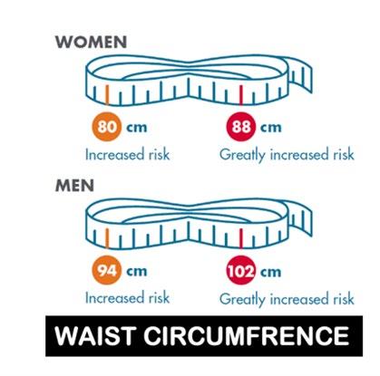 Another useful measurement is the waist size. This is used to determine if there is too much fat in the middle of the body, as a large waist measurement means more visceral fat and the associated with health risks. This waist measurement is different from the conventional waist size used for shopping for clothes. The waist circumference is usually just above the belly button, about halfway between the bottom of the ribs and the top of the hips. Health risks increase as waist size increases, regardless of BMI.