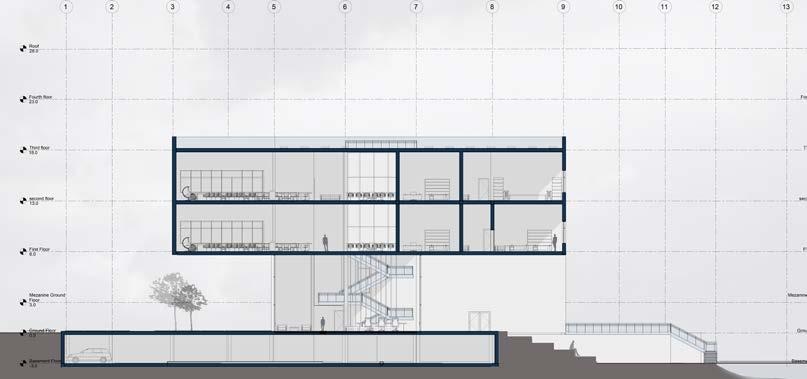 The building uses pioneering methods such as the steel structure used due to its flexibility and allowing big spans ,thus creating a lot of open space for the co-working offices . In addition, the cutting edge fiber cement used allows durability , fire and rain resistance.
