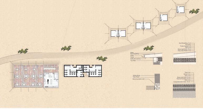 Locally sourced Materials such as rammed earth , sandstone ,timber ,adobe and fabric are used throughout