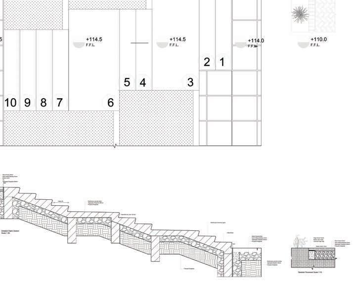 DPC 2 cm Sand 6 cm Straw Light Earth 10 cm Compacted drain rocks 10 cm Mortar 2 cm Tiles 2 cm Reed insulation 10 cm Crushed volcanic rock filling 17 cm waterproofing 2.5 cm Solid wood slab 18 cm Sloped Low-fired mud tile covering 4 cm DPC 2 cm Sand 6 cm Straw Light Earth 10 cm Compacted drain rocks 10 cm Mortar 2 cm Tiles 2 cm A B C D E F 4.0 8.30 0.9 7.15 0.9 1.3 0.50 0.55 1.65 0.50 0.55 1.65 2.2 1.2 3.0 0.3 3.4 3.4 +4.0 F.F.L. +4.90 T.O.P +0.00 Ground F.F.L. 2.00 3.20 3.1 Prepared Subgrade Stone Paving 5 cm Sand Setting Bedding 2.5 cm Aggregate Subgrade 20cm 4.0 Wooden Pergola Frame 20 cm Reed insulation 10 cm Crushed volcanic rock filling 17 cm Waterproofing 2.5 cm Solid wood slab 18 cm Sloped Low-fired mud tile covering 4 cm Wooden Pergola Frame 20 cm +4.0 F.F.L. +4.90 T.O.P +0.00 Ground F.F.L. 2.20 0.5 0.5 0.5 0.5 0.5 0.5 NOTES Name: ID: Scale Drawn: Urban Sheet General Project ARCH. Owner Approved Section 1 2 3 4 5 6 4.0 1 1.4 4.9 2.2 0.7 2.0 0.9 8.80 0.9 2.3 2.6 8.80 3.90 3.90 3.90 3.90 +4.0 Roof F.F.L. +4.90 T.O.P +0.00 Ground F.F.L. 8.90 +0.00 Ground F.F.L. 8.90 +4.0 Roof F.F.L. +4.90 T.O.P 2.4 F.F.L. +4.0 Roof F.F.L. 2.4 1 1 1 1 1 1 2 1 1 1 4 4 2 2 2 4 4 4 4 3.5 4.0 NOTES ARCH. 1 0.5 0.5 0.5 0.5 0.1 0.3 0.5 0.5 0.5 0.5 0.1 0.3 2.2 2.2 0.3 0.2 0.2 0.2 0.4 0.5 0.5 0.5 1.6 2.2 1.1 03 A 04 A 0.5 0.5 0.5 0.5 0.5 0.5 0.5 0.5 0.5 0.5 0.2 0.5 0.5 0.5 0.5 0.5 0.5 0.5 0.5 0.5 0.5 0.5 0.5 0.5 0.2 0.5 0.5 0.8 0.2 2.0 2.0 0.8 0.2 0.2 1.4 0.4 2.6 3.0 0.4 +3.50 CFL +3.50 CFL +3.85 CFL +3.85 CFL +3.85 CFL +3.85 CFL +3.85 CFL +3.85 CFL +3.85 CFL +3.85 CFL +3.85 CFL 02 03 0.50 1.0 2.2 2.2 +3.85 CFL +3.85 CFL +4.0 FFL Scale Drawn: Date 24 JUNE 2021 Proj.No. North Sheet Name General Consultant Project ARCH. ISSUED FOR DATE G U C - German University in Cairo Architecture and Urban Design Program WS 2020-2021 ARCH902_Working Drawings Course ARCH902_Working Drawings Course_Project ARCH 902 - 001 Owner G U C - German University in Cairo 1:20 Reception BlOW-UP
