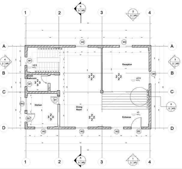 +00A 3 AR A 3 AR 1.5 3.0 3.0 1.5 1.5 3.0 1.5 3.0 1.5 1.9 1.9 1 2 3 4 5 6 1 2 3 4 5 6 A B C D E F A B C D E F Reception 25.0 6.8 2.0 16.2 6.1 3.7 3.1 3.1 2.3 6.5 2.9 1.0 3.3 1.7 2.4 0.8 1.4 1.2 1.4 6.8 6.5 2.3 3.1 9.8 1.7 6.2 3.1 25.0 0.2 0.7 1.5 2.0 1.3 D2 W1 D4 D4 D4 D4 D4 D3 4.6 1.2 1.4 3.8 3.7 2.5 1.5 3.0 3.0 1.5 1.5 3.0 1.5 3.0 1.5 1.9 1.5 +00 F.F.L. - +002.9 2.4 1.6 2.3 +00 F.F.L.0.5 0.5 3 2 3 2 3 2 3 3 2 3 3 2 3 3 2 AR 2 2 AR 4 2 AR 3 2 AR 0.4 1.6 0.9 0.6 1.0 1.4 3.7 0.4 1.0 1.7 0.6 0.9 1.3 3 2 3 2 3 2 3 2 3 2 3 3 2 3 D5 W2 D3 W3 W4 2.0 Dinning hall GR 001 B02 Workshop room GR 004 B01 Workshop room GR 001 B01 Bathroom GR 002 B01 Kitchen GR 004 B02 Storage Room GR 005 B02 Bathroom GR 003 B02 Bathroom GR 002 B02 A Outdoor Bakery GR 006 B02 3 2 3 3 3 2 3 3 2 5 6 7 8 10 9 15 16 11 D2 W4 D2 W4 D2 W4 D2 D2 D2 D2 Bathroom GR 003 B01 D1 D5 W1 W1 W1 W1 Ceiling Finishing Table Walls Finishing Table Skirting Finishing Table Floor Finishing Table 2 Windows Table CODE TYPE SILL HEIGHT W3 0.9 1.5 *1.3 CODE DIMENSIONS TYPE SILL HEIGHT WIDTH HEIGHT (Meter) D1 * 2.20 1.2*2.20 Doors Table 3 2 3 2 Skirting Ceiling Finish Wall Finish D D 0.8*2.20 1.6*2.20 D 0.9 0.9 Scale Date 24 JUNE 2021 Sheet Name General Consultant Project ARCH. ISSUED G U C - German Architecture and Urban Design ARCH902_Working Drawings Review and Approval Owner Approved by: G U C - German Architecture and Urban Design 1:50 Ground Plan 0.30 0.5 0.5 0.5 0.5 0.5 0.5 0.1 0.9 1.3 0.2 0.2 0.3 0.2 0.7 1.5 2.0 1.3 0.5 0.5 0.2 1.0 0.2 1.2 0.3 1.2 1.0 0.2 1.5 1.2 1.2 1.3 5.7 0.50 2.70 0.3 0.5 7.50 6.2 6.2 7.5 01 2.2 2.2 +3.85 CFL +4.0 FFL NOTES General Consultant Project ARCH. ISSUED FOR G U C - German University Architecture and Urban Design Program ARCH902_Working Drawings Course_Project Owner Review and Approval G U C - German University Architecture and Urban Design Program