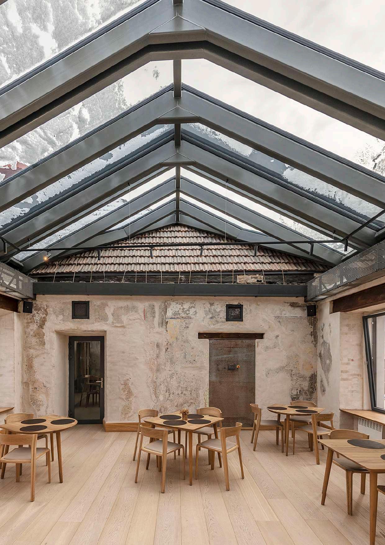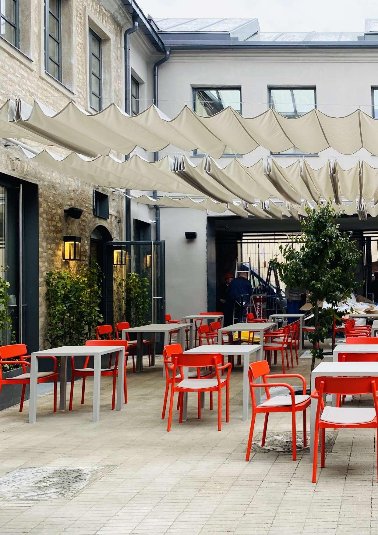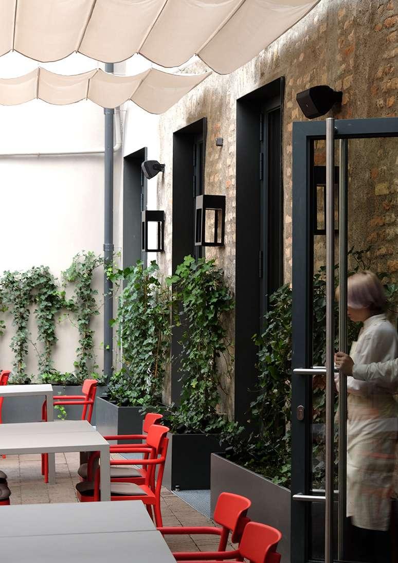 The thick fabric roof is rolled out in the summer and pushed to the side in the winter. It protects from direct sunlight and provides privacy. Many different historic periods are reflected through the materiality of the facades exposing various bricks and plaster layers. The red chairs are part of design to match with accents of facade.