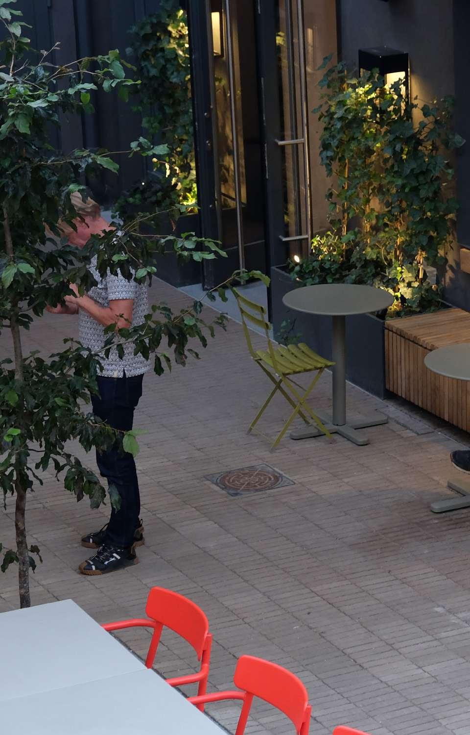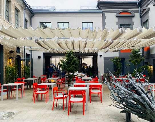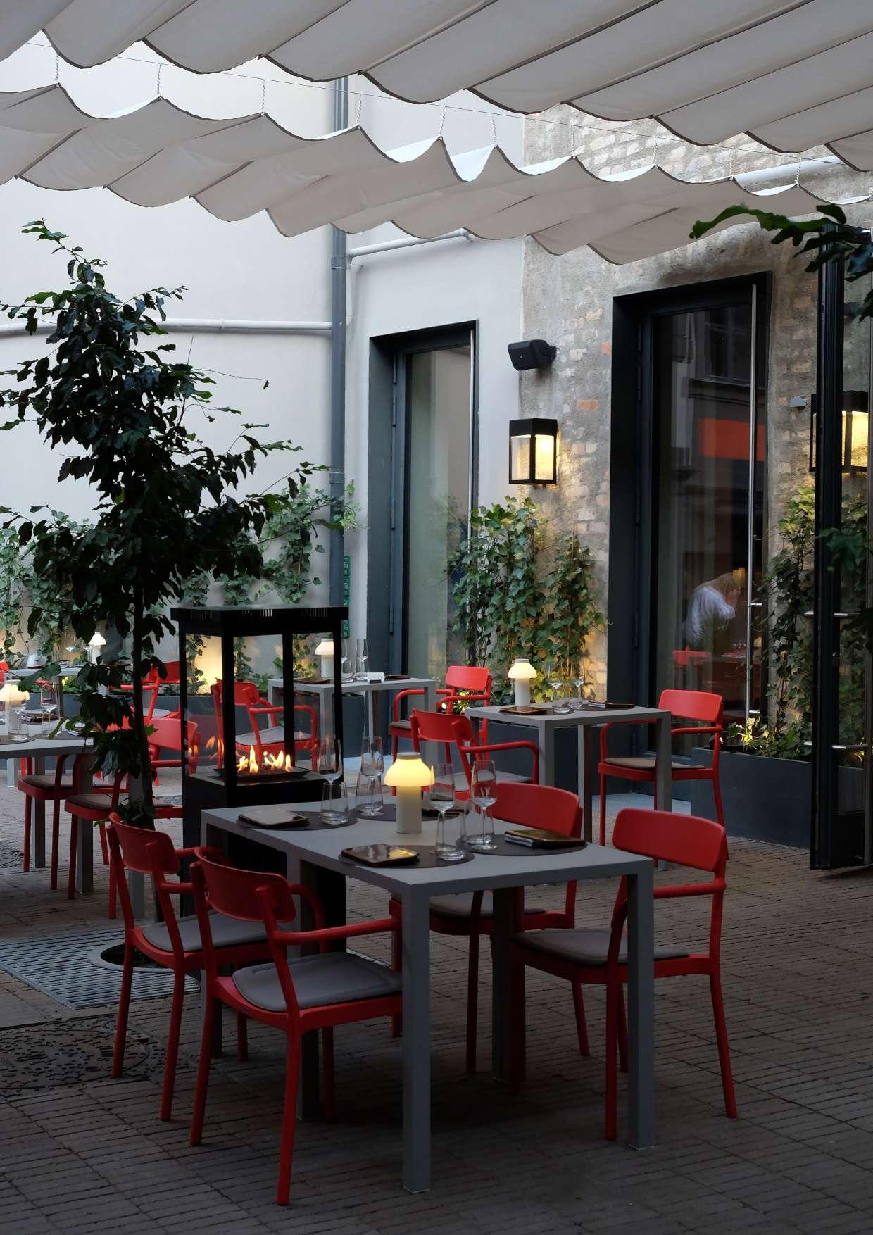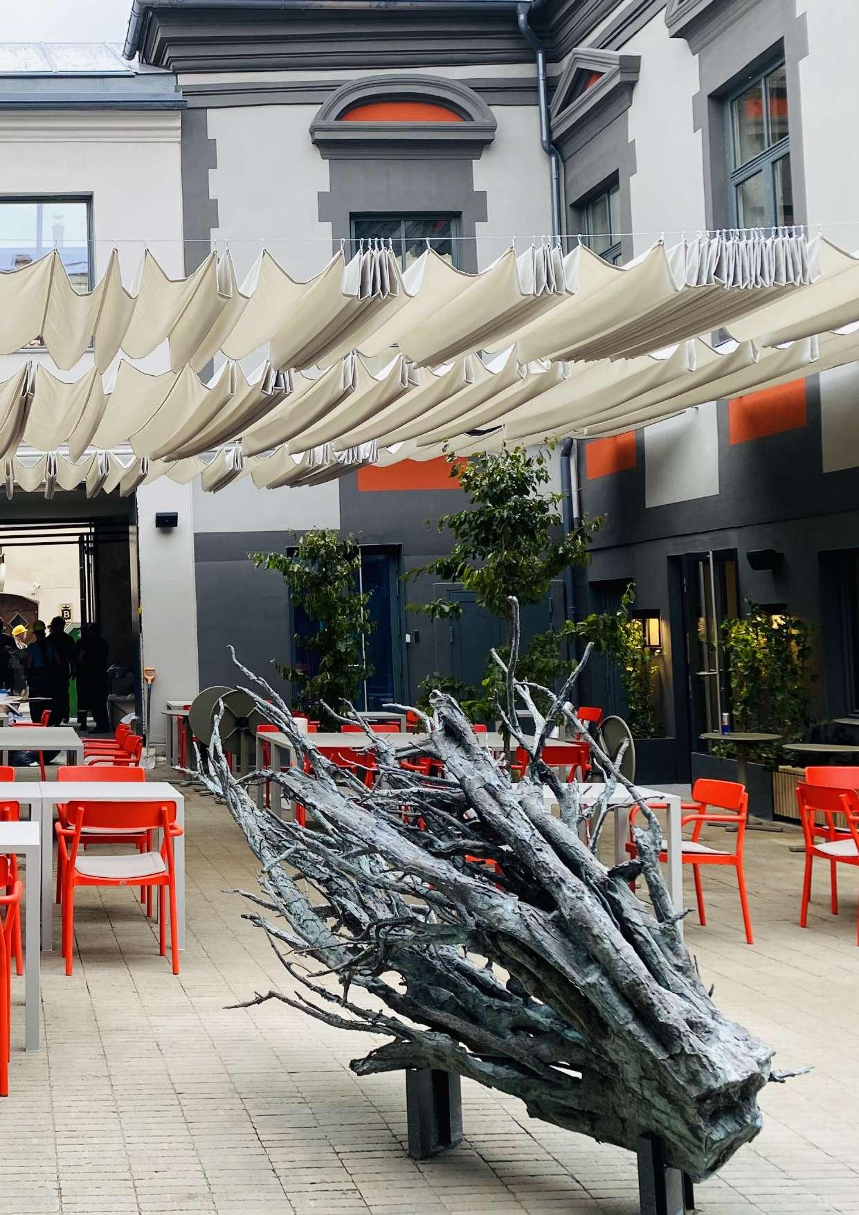 The thick fabric roof is rolled out in the summer and pushed to the side in the winter. It protects from direct sunlight and provides privacy. Many different historic periods are reflected through the materiality of the facades exposing various bricks and plaster layers. The red chairs are part of design to match with accents of facade.