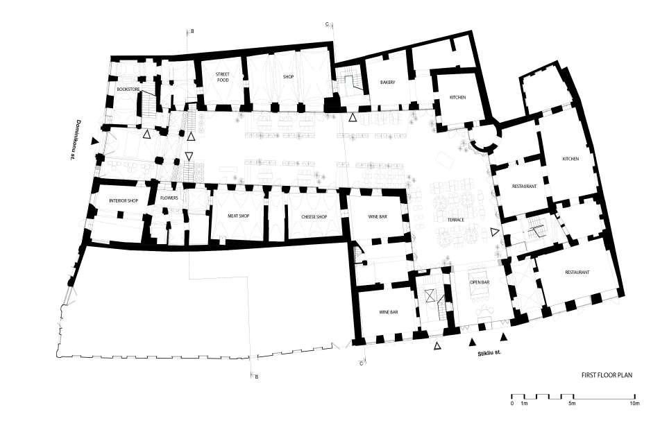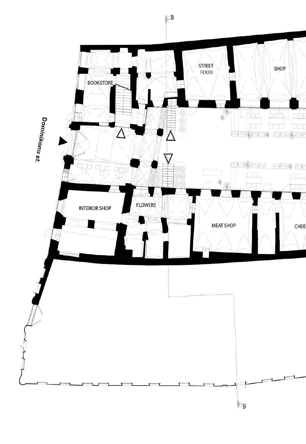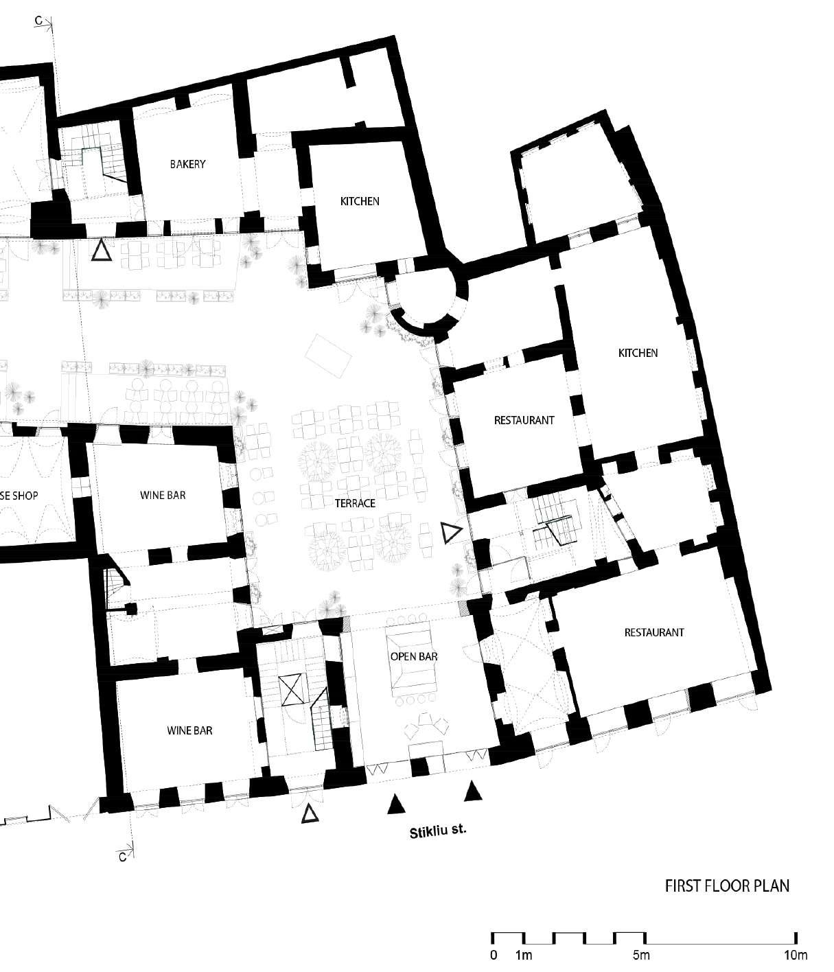 The passage to the Stiklių str. is restored, entrances from sides of Stiklių str. and Dominikonų str. are restored in the whole complex and the courtyard becomes a public city space.