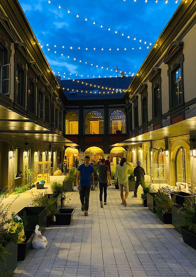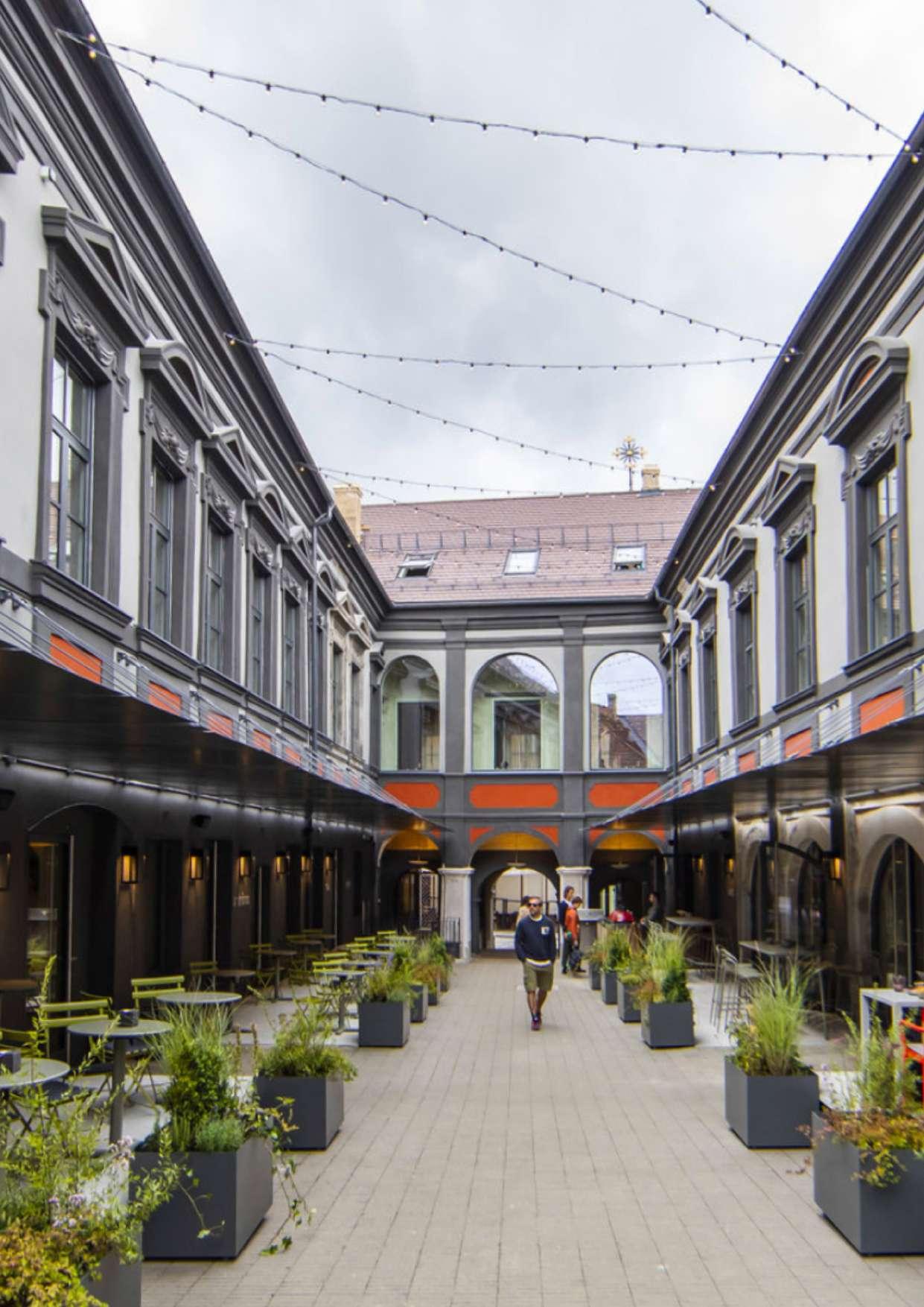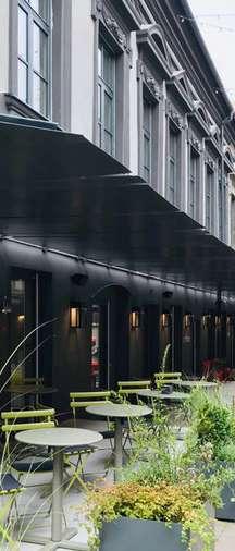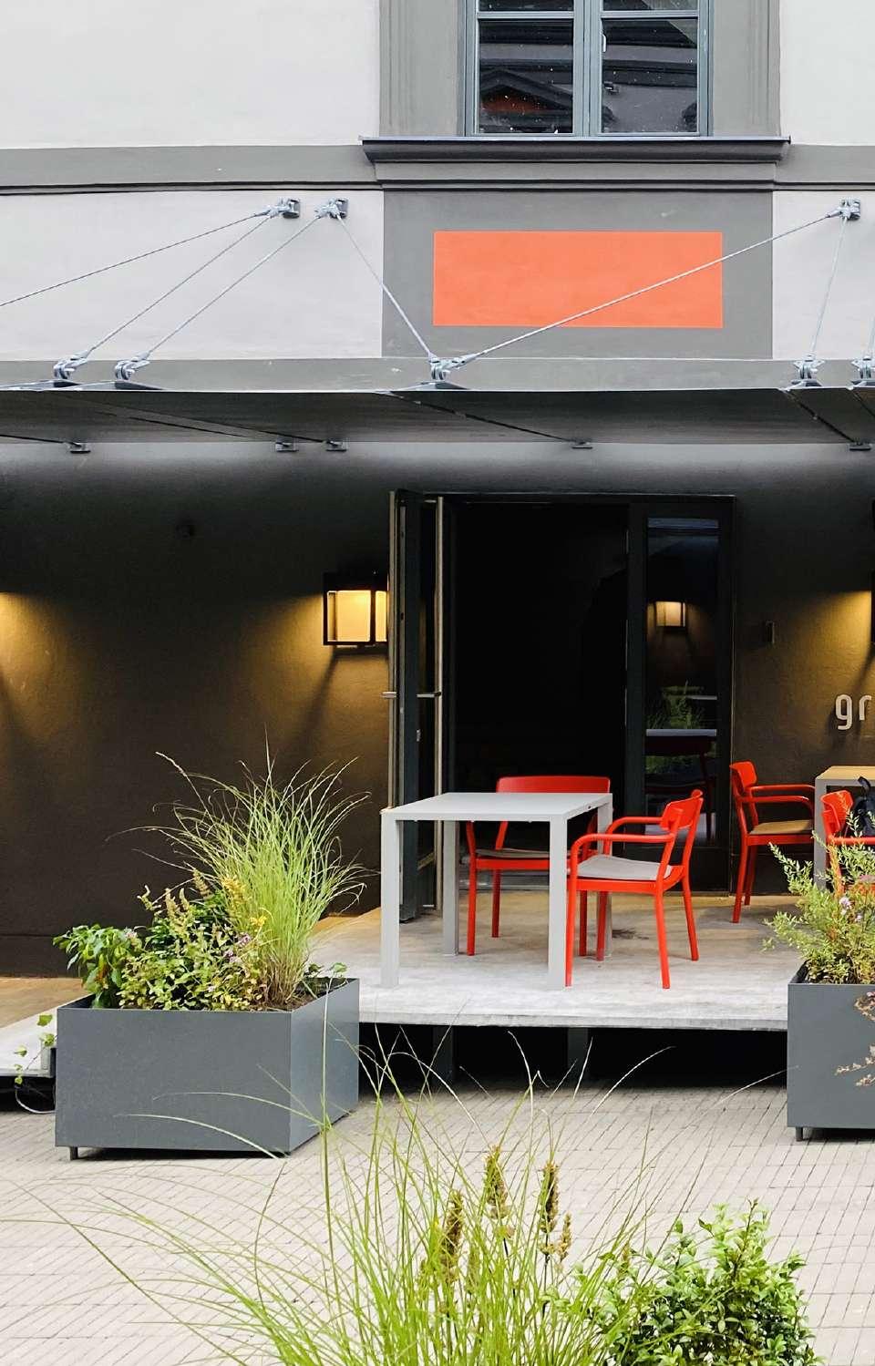 New passage connection between nearby streets creates a vibrant public space with 20 restored authentic entrances highlighted by modern details, levitating concrete terraces, and a street fireplace. On the ground floors, cafes, wineries, restaurants and pastry shops open onto the courtyard. The courtyard terrace allows you to enjoy all the functions at once.