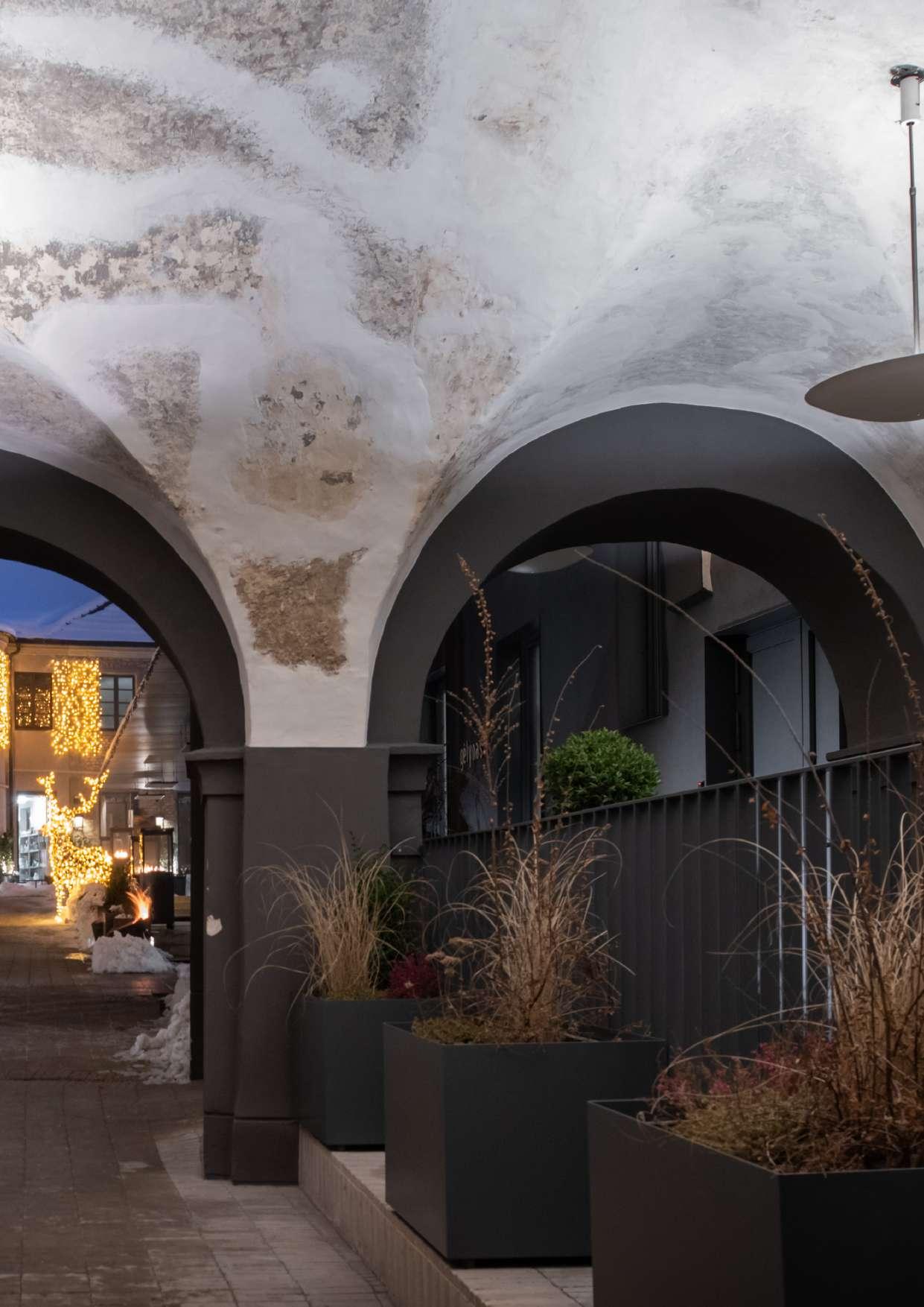 The project is about rehabilitation of one of the oldest Vilnius family palaces into a vibrant old town quarter. Based on many historical, architectural, polychrome researches, a profound relationship was sought between precious heritage and bright, warm, expressive modern architecture exhibiting 400 years of historical layers. New passage connection between nearby streets creates a vibrant pedestrian passage with 20 restored authentic entrances highlighted by modern details, levitating concrete terraces, and a street fireplace.