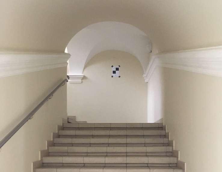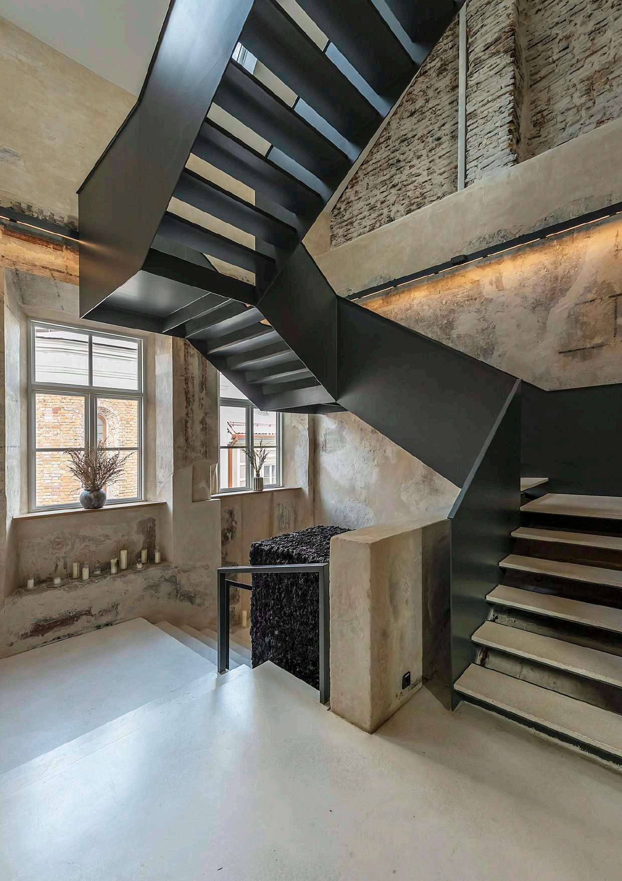 All of the complex staircases are a synergy between the layers of history, including the contemporary. Staircase are like a sculpture, but it also features actual piece of art I the centre – sculpture “Soil Sufrace”. All staircases are uniquely different and complex in architecture, as they adapt to the existing structure of the building. Thin black sheets of metal are not trying to establish themselves in historicism, but rather are creating a new historical layer on their own.