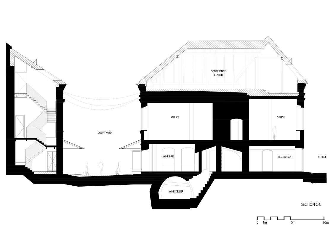 Section C/C shows the complex architecture and many levels of building. The Vaults are now revealed to public.