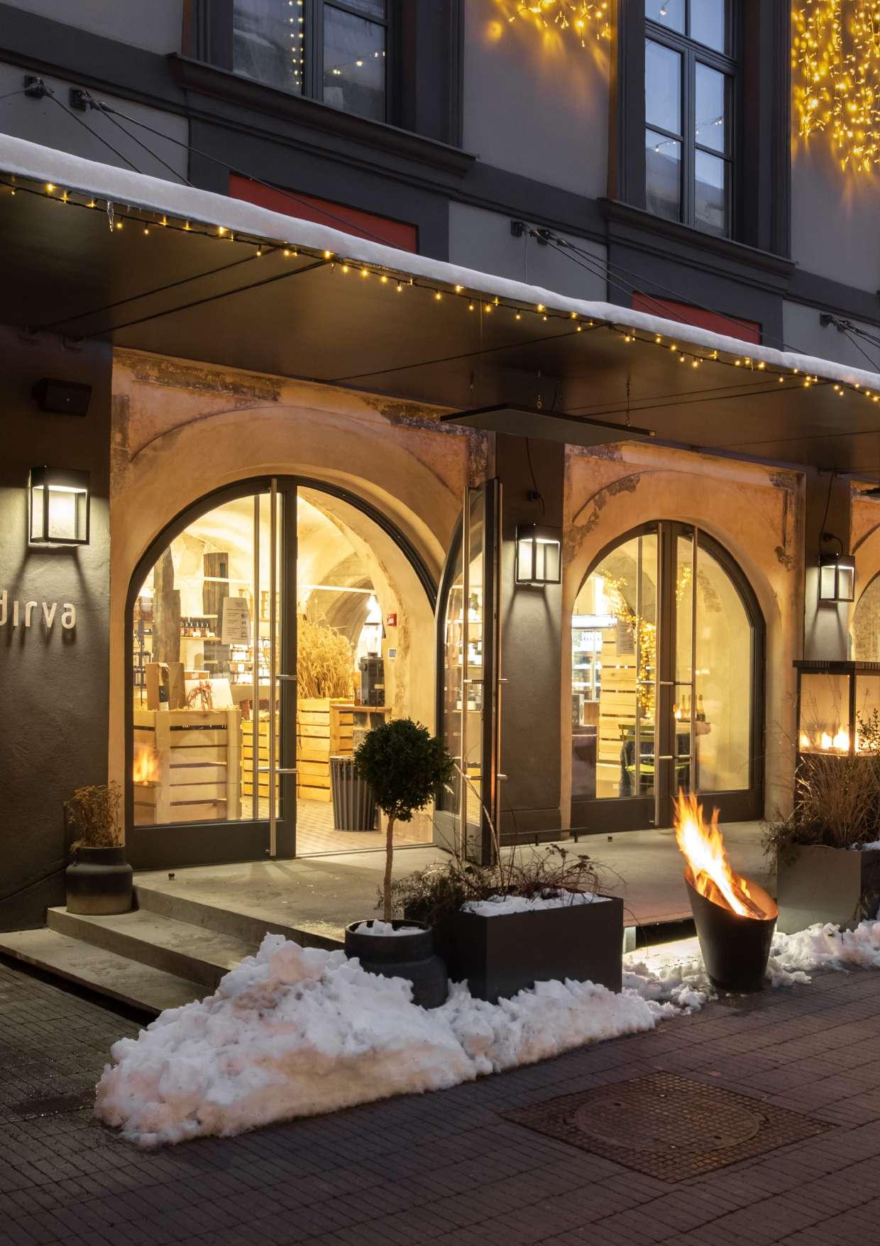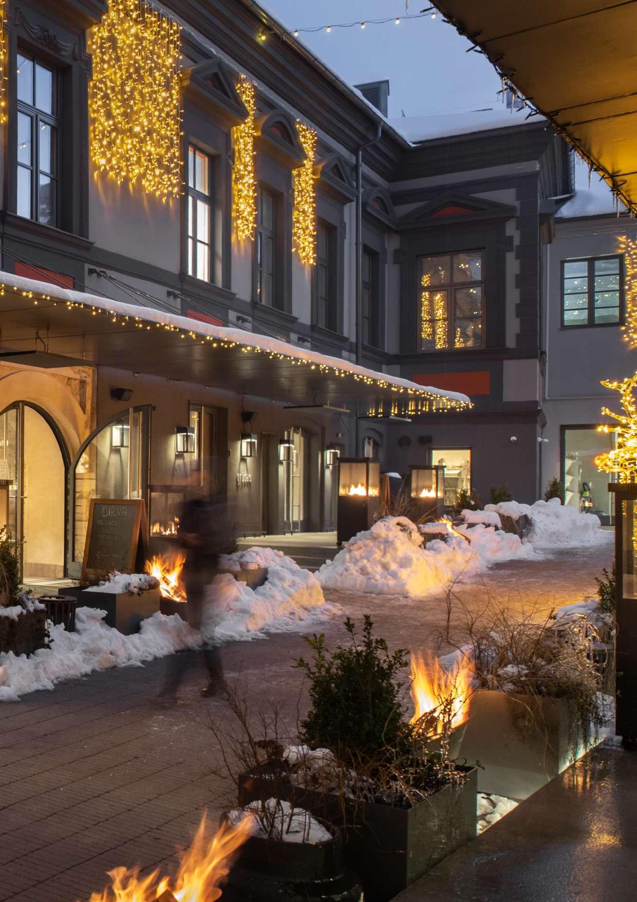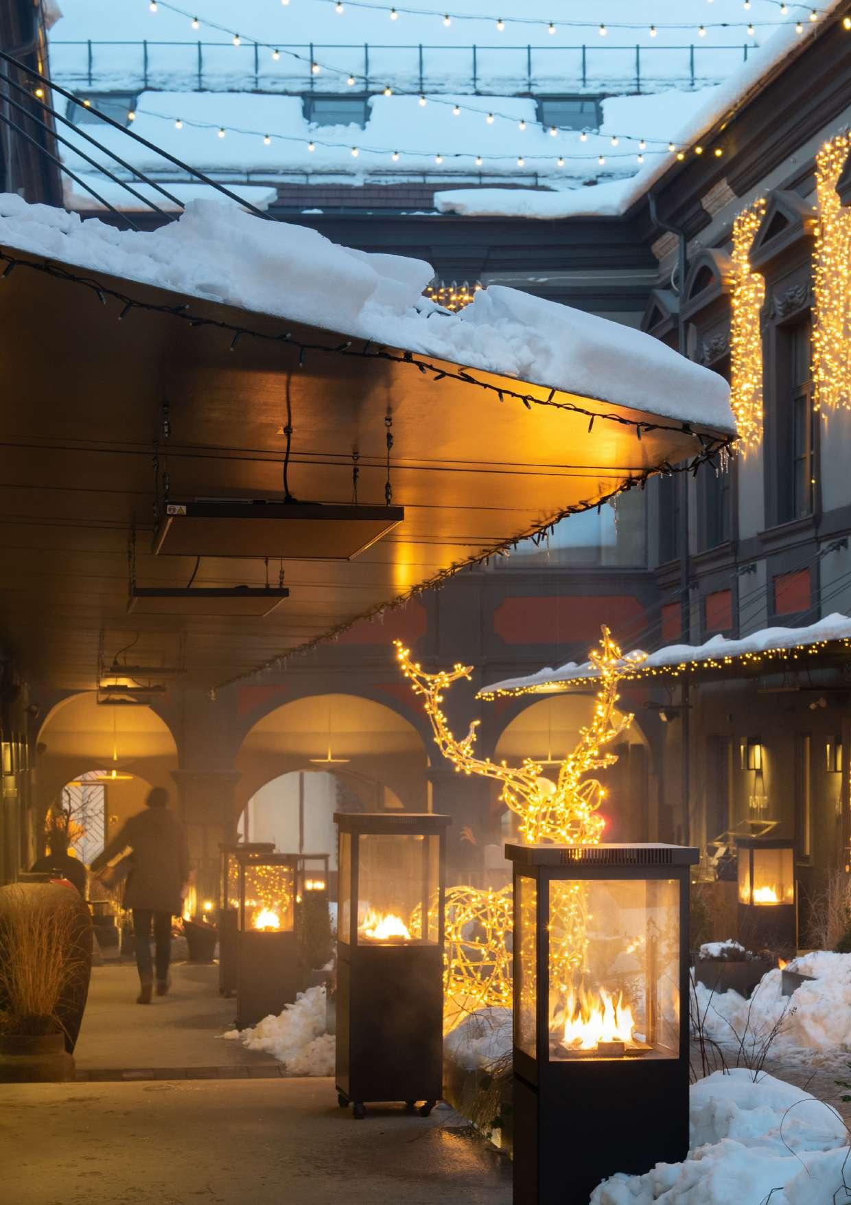 The passage and outdoor spaces work perfectly all year around. In cold weather, outdoor hot wine stands are opened here, outdoor heaters bring warmth for passers-by, food and traditional Christmas attributes can be bought here. With plenty of snow in the winter, the view of the yard changes dramatically and becomes even more impressive and cozy.