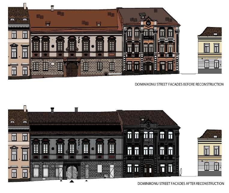 Dominikonų str. facades before and after reconstruction. The many window openings which have been closed in soviet period now are openeded once again. The changes in facade structure and colouring are also visible.