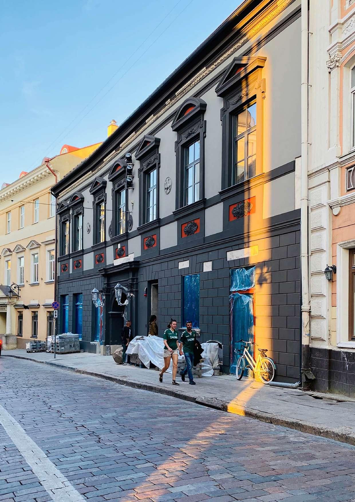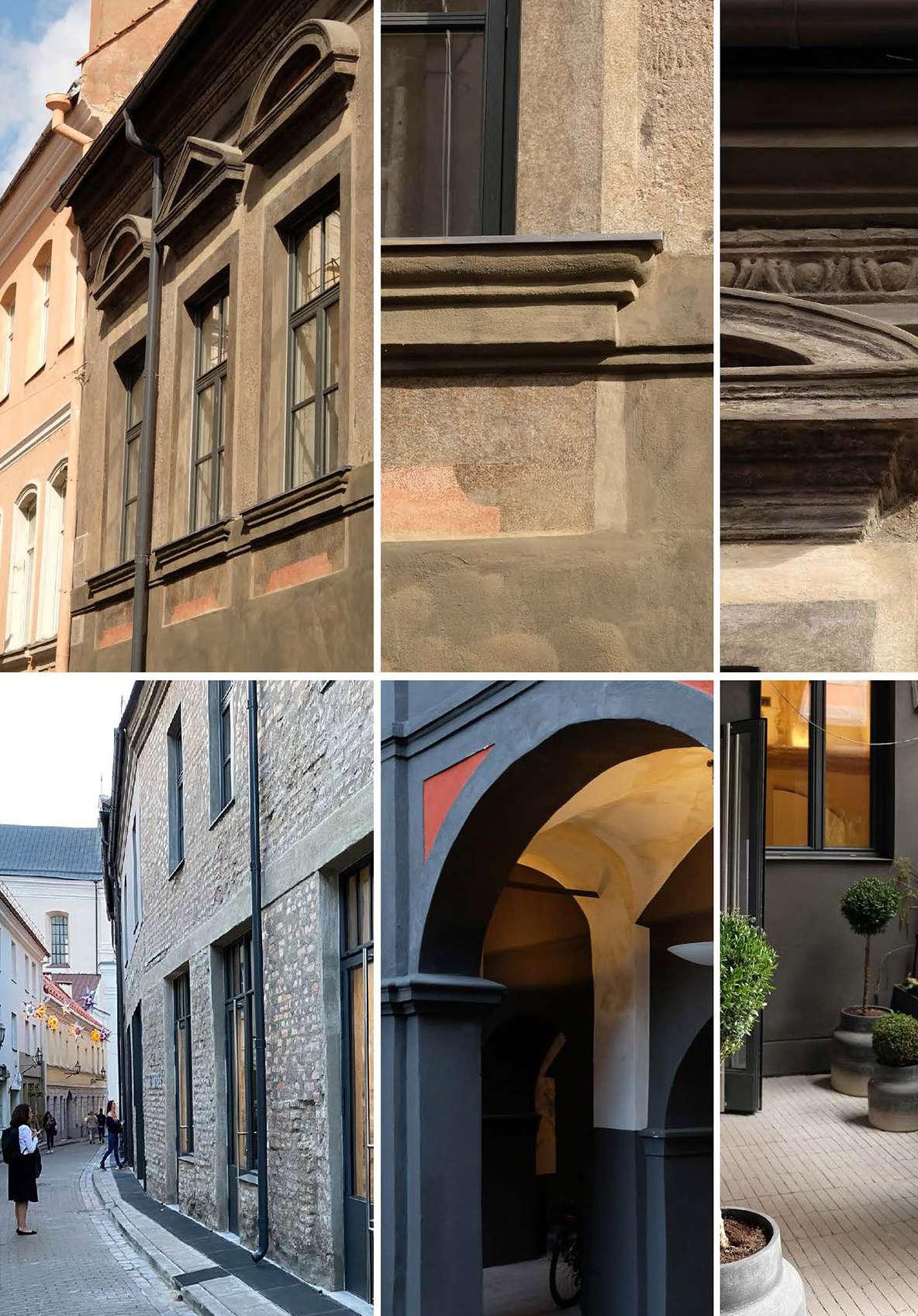 A number of authentic things were discovered, exposed and opened up to the public with the finish of this project. The goal of the project was to interpret the the rich historical principles in a modern way to create new functions. Thus in a picture, a façade with one of entries from Dominikonų str. can be seen. Historic polychromic research was done on this building facades and dark tones with red inserts were brought back restoring original period colouring.