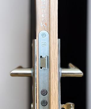 Łączenie okleiny jest niewidoczne, ukryte w przyldze (drzwi płytowe) lub pod uszczelką (drzwi wewnętrzne wejściowe), lub wewnątrz drzwi (drzwi modułowe).