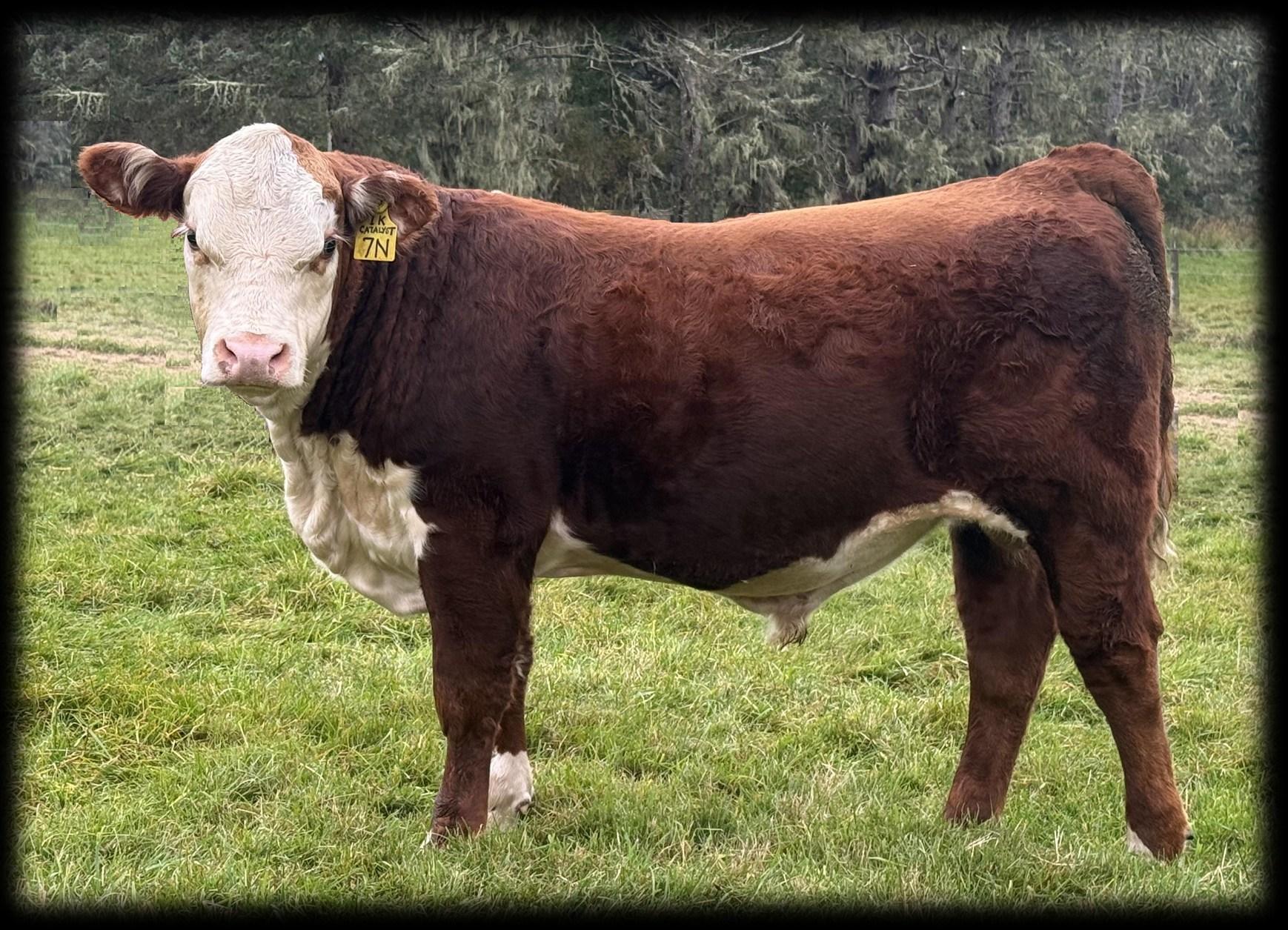 One of the top bulls in our 2022 calf crop. Used to cleanup our mature cows after AI in Tlell spring of 2023. This powerful, stout, rugged, sire was sold to Lee Migvar. His dam was a donor dam, flushed multiple time with embryos exported to Europe.