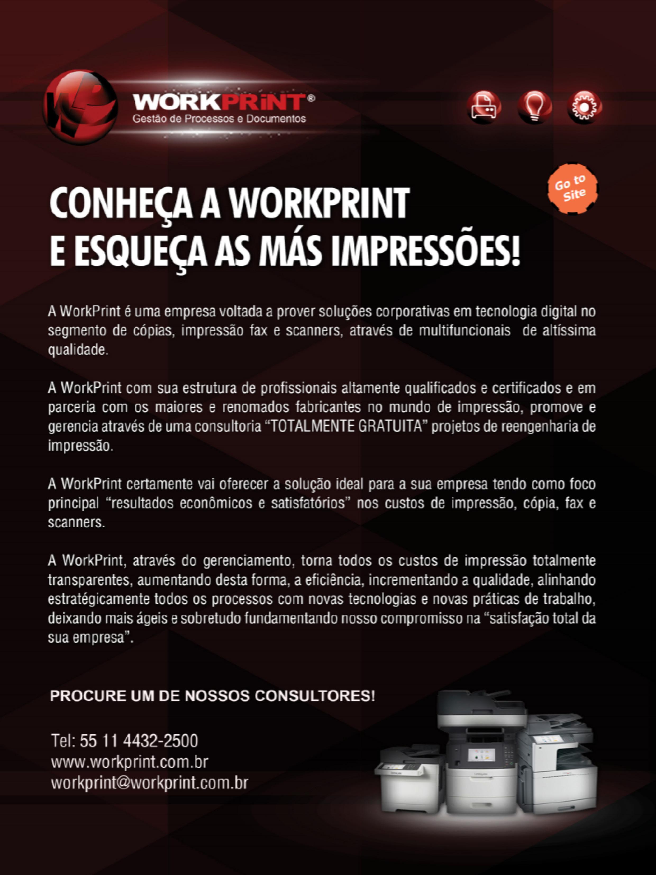 A WorkPrint com sua competente estrutura de profissionais altamente qualificados e certificados, em parceria com os maiores e renomados fabricantes no mundo de impressoras, multifuncionais e softwares de impressão, promove, implanta e gerencia através de uma consultoria totalmente gratuita projeto de re-engenharia de impressão e cópia, em busca a oferecer a solução ideal para sua empresa, tendo como foco principal o resultado econômico e satisfatório nos custos de impressão e cópias, tornando-os transparentes, aumentando a eficiência, incrementando a qualidade, alinhando estrategicamente todos os processos com novas tecnologias e novas práticas de trabalho deixando-os mais ágeis e sobre tudo fundamentando nosso compromisso na satisfação total de nossos clientes.