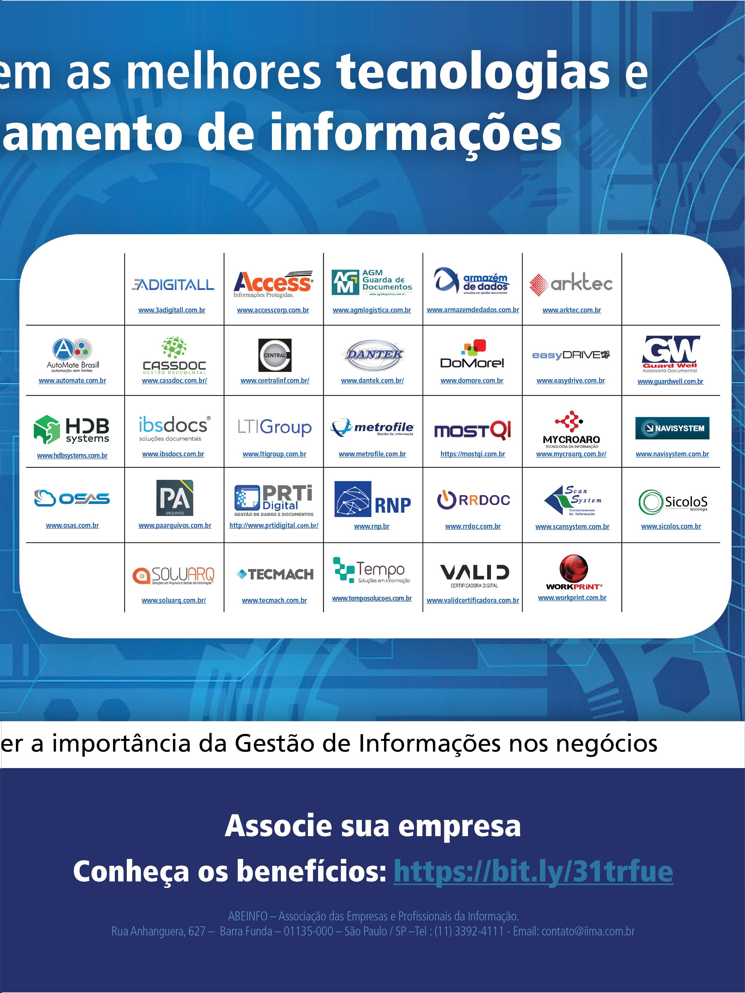 ABEINFO – Associação das Empresas e Profissionais da Informação. Rua do Bosque, 1589 - 8º andar / CJ 809 e 810 - CEP 01136-001 - Barra Funda - São Paulo/SP Tel : (11) 3392-4111 - Email: contato@iima.com.br