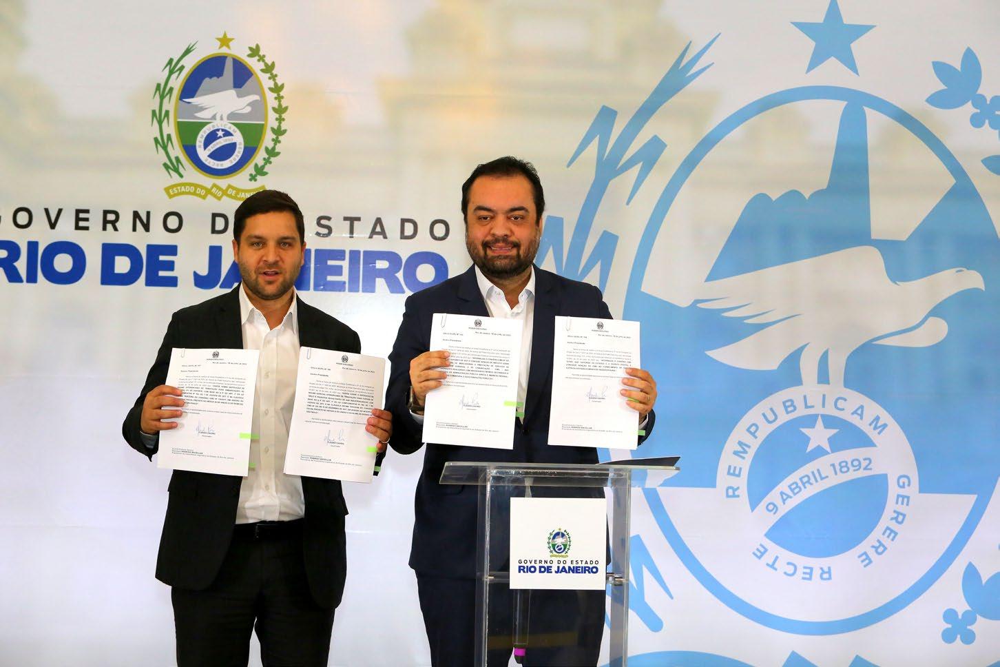 Com viés social. Thiago Pampolha (vice-governador) e Cláudio Castro na cerimônia no Palácio Guanabara