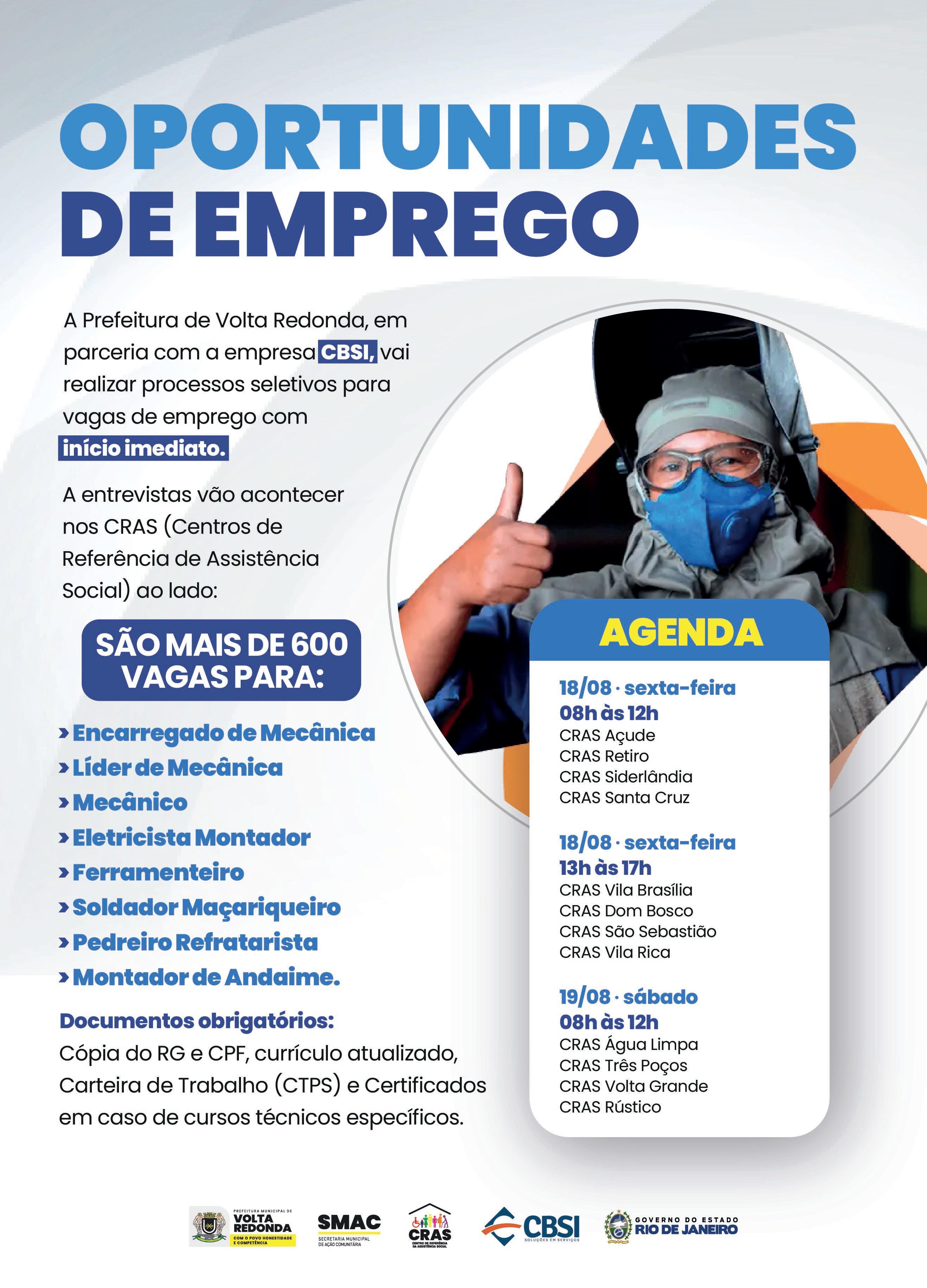 A Prefeitura de Volta Redonda disponibiliza, nesta sexta-feira (18) e sábado (19), Centros de Referência de Assistência Social (Cras) para a realização do processo seletivo da empresa CBSI Soluções, para mais de 600 vagas com início imediato. — Identificamos que a seleção pela Internet restringia o acesso às oportunidades. O nosso objetivo é que as vagas sejam ocupadas preferencialmente por moradores de Volta Redonda — disse o prefeito Antonio Francisco Neto.