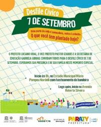 Para este ano, a Secretaria de Educação preparou o desfile para homenagear a cultura, a gastronomia, a agricultura e a pesca familiar. O evento começa a partir das 8h no estádio municipal Mario Pompeu Nardelli, seguido do desfile das escolas do município, Guarda Municipal, Defesa Civil e Marinha. Desfile Cívico Estádio Municipal, Qui (7), 8h www.paraty.rj.gov.br