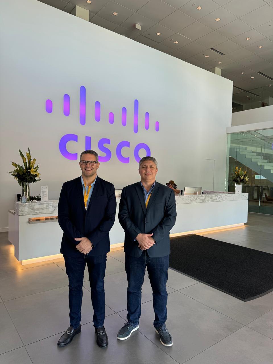 Mauro e Flávio na sede da Cisco, na Califórnia, uma das maiores empresas de tecnologia e inovação do planeta