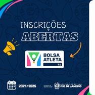 A Secretaria de Estado de Esporte e Lazer informa que termina nesta segunda-feira (22) as inscrições para o Bolsa Atleta RJ. Todos os detalhes estão disponíveis no edital de seleção que está publicado no Diário Oficial do Estado e no site da Secretaria. São 600 vagas para atletas e paratletas, a partir dos 12 anos de idade, com bolsas que vão de R$ 500 a R$ 5 mil, contemplando desde a base até os esportes olímpicos.