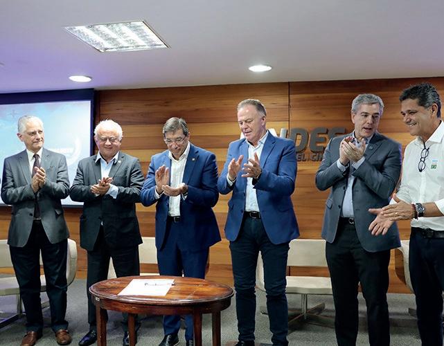 O presidente da Firjan, Luiz Césio Caetano, visitou a sede da Federação das Indústrias do Espírito Santo (Findes), em Vitória (ES), na quarta (11), para discutir soluções para gargalos de infraestrutura e integração de modais logísticos. O encontro reuniu representantes das federações do Espírito Santo (Findes), Bahia (Fieb), Goiás (Fieg), Minas Gerais (Fiemg) e São Paulo (Fiesp). Na ocasião, foi lançado o Fórum de Infraestrutura do Arco Leste (InfraLeste), solução logística que conecta os portos da Bahia ao Rio de Janeiro. Também foi assinado um Termo de Cooperação entre as federações para integração e troca de informações entre instituições. — O fórum vai ser essencial para a carteira de projetos que temos hoje na ANTT. A indústria é uma parceria nossa — disse Guilherme Sampaio, diretor-geral da ANTT.