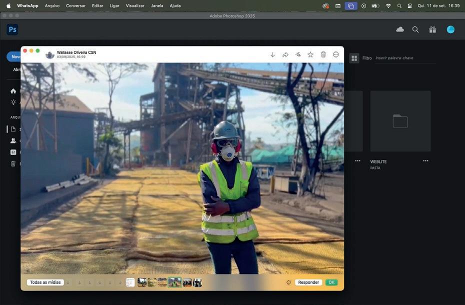 testes de uma tecnologia sustentável para controlar a poeira nas vias internas da Usina Presidente Vargas (UPV). A solução utiliza uma manta biodegradável feita de fibras de coco, tratada com nanotecnologia, que mantém a umidade do solo por até quatro dias, evitando que partículas sejam suspensas no ar. A manta pode reduzir em até 75% as emissões de poeira e economizar até 85% do consumo de água normalmente utilizado na umectação das vias. Outro efeito esperado é a maior durabilidade do pavimen-