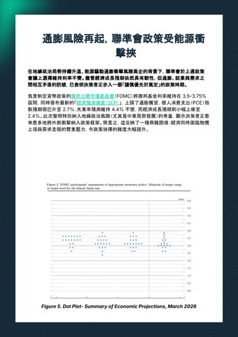 負責制定貨幣政策的聯邦公開市場委員會(FOMC)將聯邦基金利率維持在 3.53.75% 區間,同時發布最新的「經濟預測摘要(SEP)」,上調了通膨展望,個人消費支出(PCE)指 數預期現已升至 2.7%;失業率預測維持 4.4% 不變,而經濟成長預期則小幅上修至 2.4%。此次聲明特別納入地緣政治風險(尤其是中東局勢發展)的考量,顯示決策者正愈 來愈多地將外部衝擊納入政策框架。簡言之,這反映了一種兩難困境:經濟同時面臨物價 上漲與需求走弱的雙重壓力,令政策抉擇的難度大幅提升。