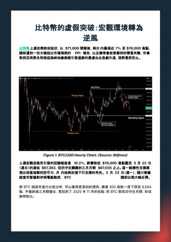 比特幣上週強勢突破至 $76,000,成功脫離二至三月的整理區間,然而隨著宏觀面壓力重燃 ,此波動能未能持續。PPI 數據大幅超出市場預期,疊加聯準會的鷹派立場,兩者共振引發 約 10% 的急 回撤。儘管如此,比特幣仍守住三月月開價位 $67,000,且相對於股票基準 指數仍呈現顯著的抗跌表現。此外,3 月 23 日(週一),隨著川普總統宣布美國在未來五天 內不會攻擊伊朗電廠,比特幣隨即出現強勁反彈,清晰印證當前市場價位以下仍有大量機 構承接力道。可以判斷,上週的初段拉升是一種強勢訊號,它早於宏觀數據與 Fed 表態發 酵前便已啟動,並帶動了本週初的急 跳升,顯示這是一種預先佈局的機構吸籌策略,而非 純粹的追漲反應。