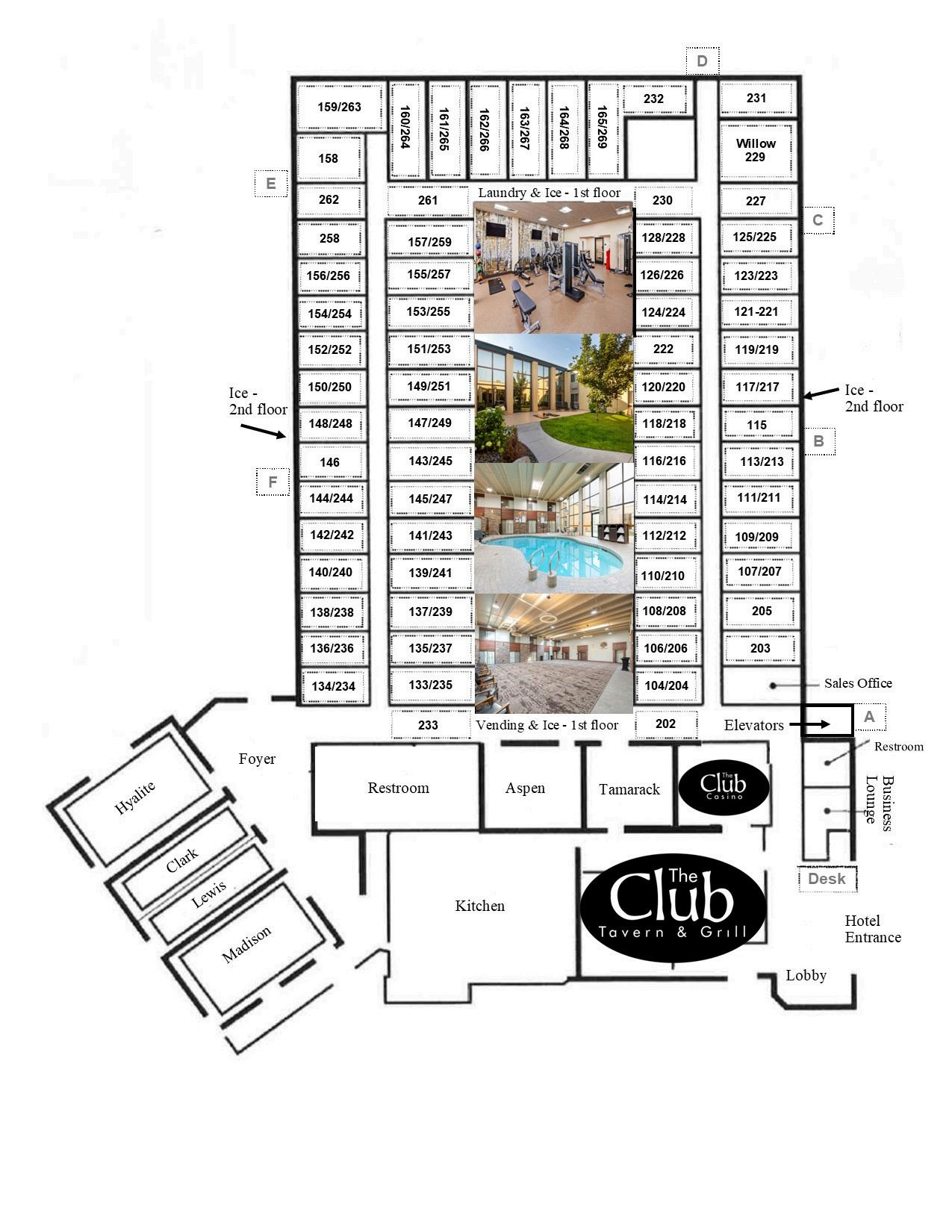 Fitness Center is located in the Courtyard across from Room 164 Key Card access Business Center is located near the Lobby Open 24 hours Restaurant is located near the Lobby. Hours at 6 AM to 9 PM. The Bar is open until Midnight. Hours subject to change and seasonal hours may apply.