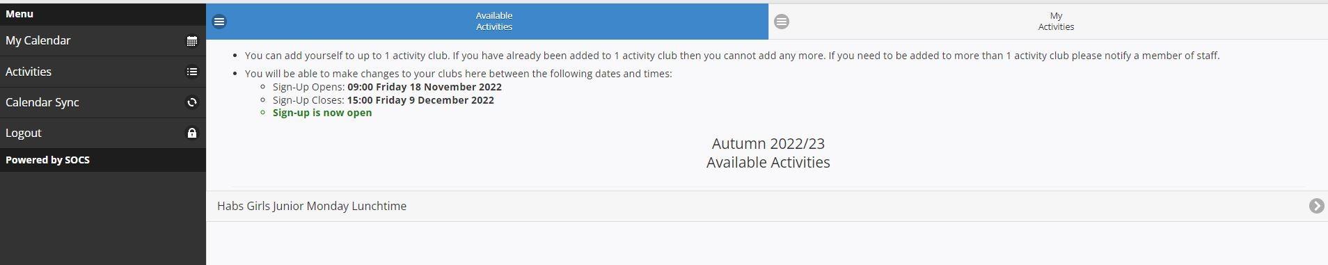 Unless an activity is indicated to be invite only, places will be allocated randomly. Whilst every effort is made to allocate students their preferred activities, there may be instances where an activity is oversubscribed. When this occurs, selection for the activity will be at random and every effort will be made to offer a similar activity the following term, where those who missed out will be prioritised during the allocation process. Once selected, pupils can view their lunchtime co-curricular choices using SOCS.