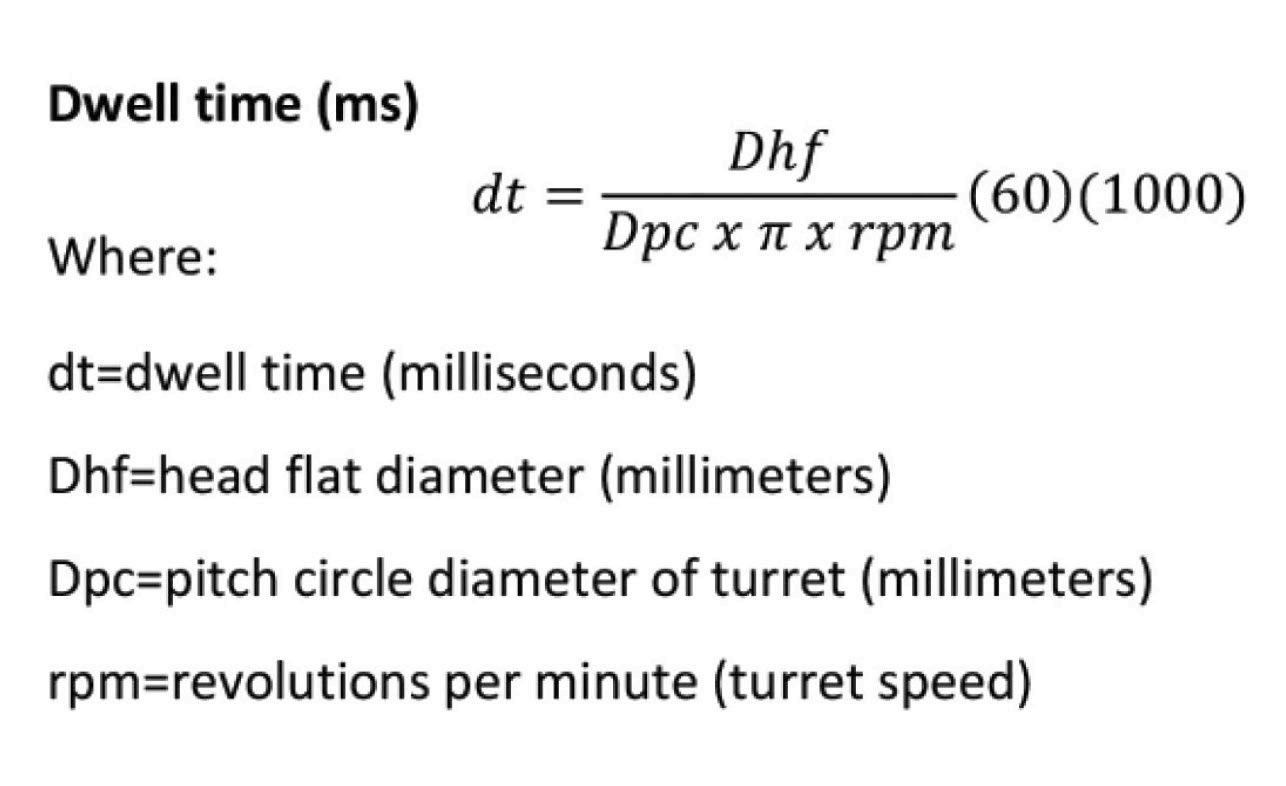 Dwell time is dependent on press speed, the pitch circle diameter of the turret, and the head flat’s diameter (Figure 1). Increasing the diameter of the head flat is the easiest way to prolong dwell time without switching