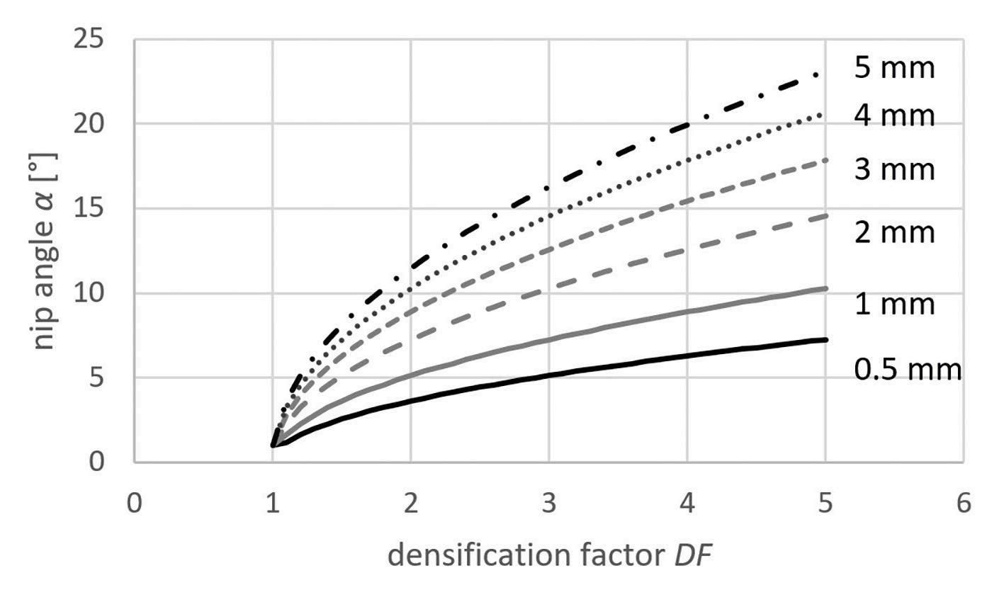 For example, a densification factor of two requires a nip angle of 5o at a
