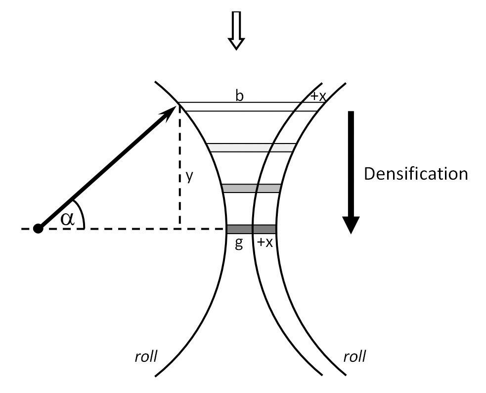 Based on the geometric considerations of the Thin Layer Model it is possible to plot the nip angle versus the densification factor of the powder for different gaps (Figure 1). And an important relation can be derived: to achieve the same densification factor at a larger gap requires a larger nip angle - see Figure 1.