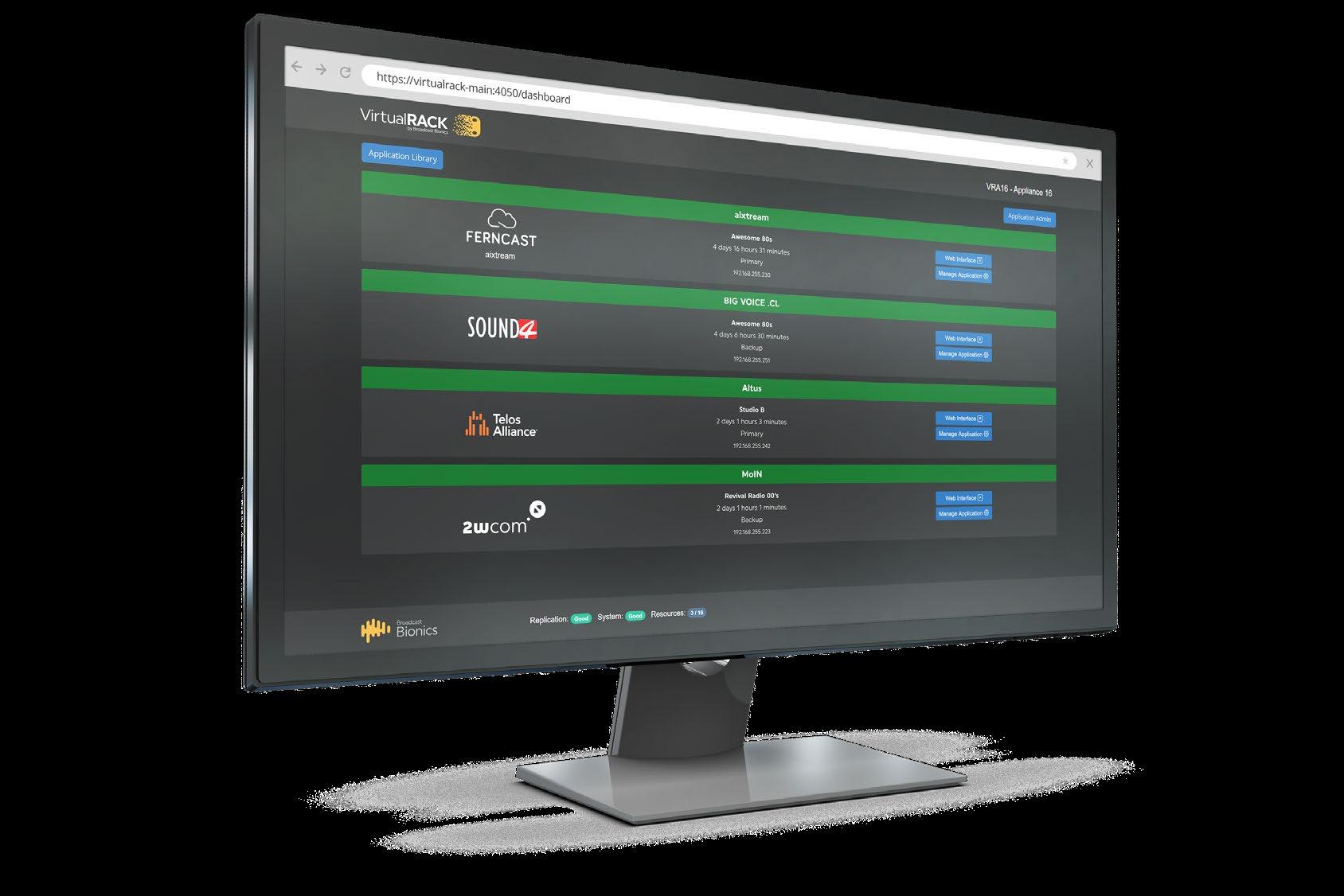 Virtual Rack lets engineers deploy and manage broadcast applications from Telos, Axia, Omnia, 2wcom, Ferncast, Sound4 and others from one browser-based interface.