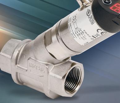 ProSense FSC mechatronic digital flow sensors monitor liquid media, and provide flow sensing up to 50 GPM and up to 212 °F. They feature stainless-steel construction, are available with 3/4-, 1- or 1.5inch, female national pipe tapered (FNPT) process connections, and provide two analog, frequency or switch outputs based on flow or temperature. A pushbutton interface allows quick and easy setup, while a bright, two-color, digital display prominently shows process variable data.