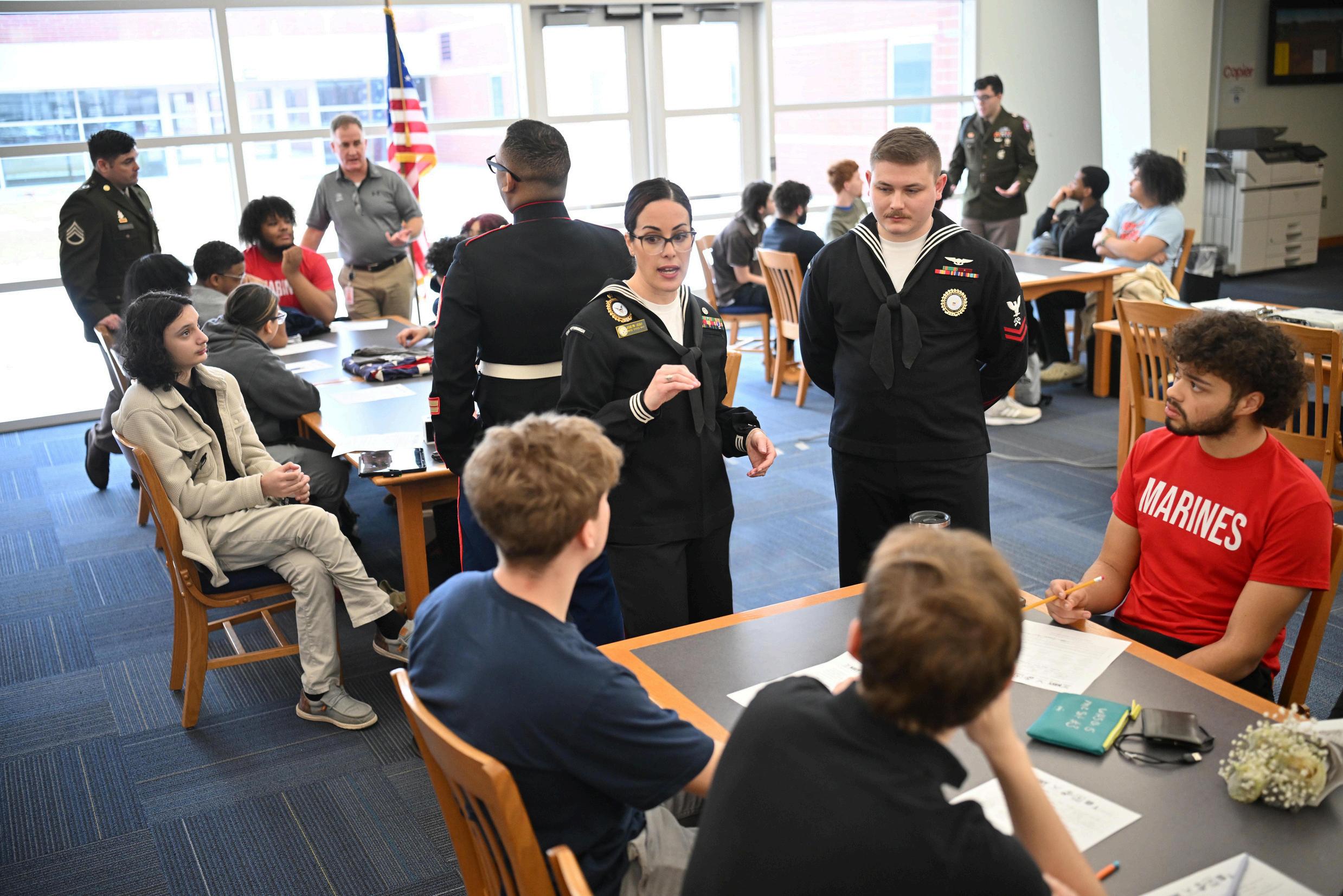 Similarly, SSGT Nicholas Irvin, an Army recruiter, discussed his personal growth since joining the military at 21. He engaged students about their career aspirations and highlighted the skills and education gained from military service, inspiring many to consider various future paths, including military and vocational training.