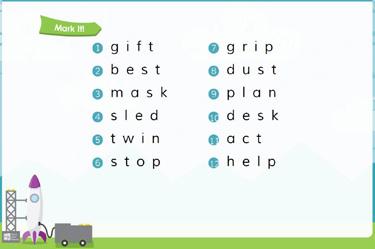 • The second half of the year (Units 17-28) focuses on using these skills to decode more complex words in isolation and in connected text. Students practice both with support and independently, and the focus is on building automaticity with letter-sound relationships, increasing scaffolded and independent phonics decoding and spelling practice, building automaticity with high-frequency words, and reading connected text. By the end of the Countdown program (Unit 28), students should be able to read and understand the structure of more complex single-syllable Closed Syllable words, like dust, hush, smash, and west, as well as two-syllable words where both syllables are closed, like sunset and picnic.