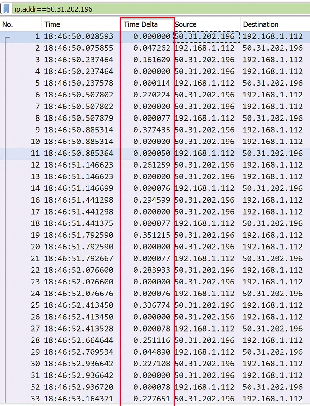 Above Wireshark display with time delta column added.
