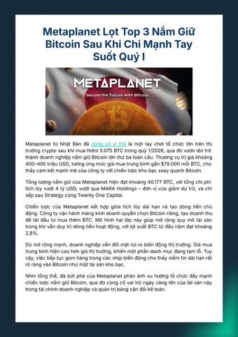 ● MetaplanetLọtTop3NắmGiữBitcoin SauKhiChiMạnhTaySuốtQuýI