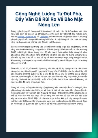 Trongbốicảnhdòngtiềnbịhạnchế,Bitcoinvẫnđangâmthầmgópmặtvàohàng ngũ tài sản của các ông lớn. Các ông lớn như Metaplanet liên tục gom BTC và củngcốvaitròcủatàisảnnàytrênbảngcânđốikếtoánnhưmộttàisảndựtrữ chiếnlượcchotươnglai.ChínhphủMỹcũngbắtđầucoitrọngBitcoinhơnkhiđưa racác“ĐạoluậtKhaitháctạiMỹˮkhuyếnkhíchkhaitháctrongnướcvàxâydựng khodựtrữBitcoinquốcgiađểtăngcườngvịthếtrênthếgiới.Tuynhiên,mộtmối lomớixuấthiệntừcôngnghệđiệntoánlượngtử.Côngnghệnàyđangpháttriển quá nhanh và dự đoán có khả năng bẻ khóa các hệ thống bảo mật tiền mã hóa hiệntại.“NgàyQˮ–ngàymàcácmáytínhlượngtửcóthểphávỡmậtmã–đang đến rất gần. Vì vậy, việc nâng cấp các hệ thống bảo mật để chống lại siêu máy tínhlượngtửđangtrởthànhnhiệmvụsốngcònchotươnglaicủaBitcoinvàcác loạitàisảnsốkhác.
