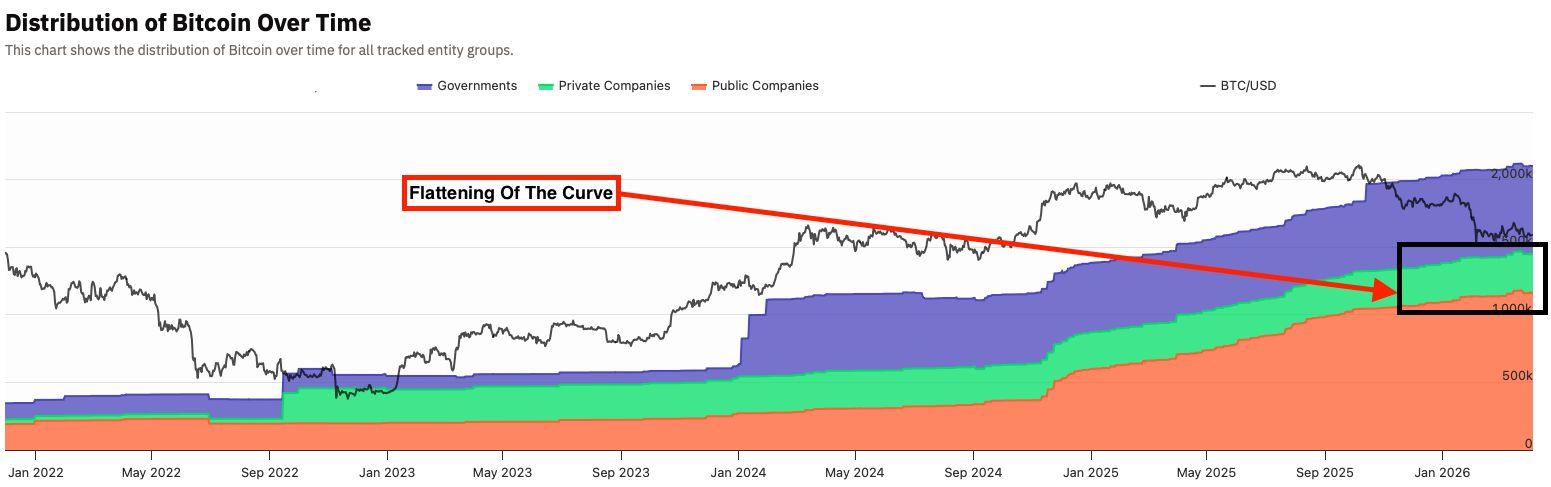Hình4PhânBốBitcoinGiữaDoanhNghiệpTưNhân,NiêmYếtVàChínhPhủ. NguồnDữLiệu:BitcoinTreasuries.Net)