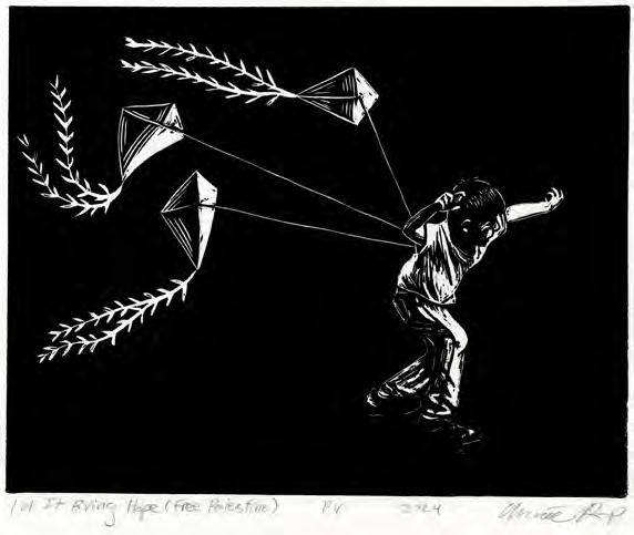 The open call attracted 127 submissions, resulting in a 56-piece show curated by experienced Twin Cities printmakers Christopher Alday, Genie Hien Tran, and Edson Rosas. “There was a pretty solid variety of techniques used in the pool of submissions,” said Christopher, who typically works in screenprinting and letterpress printing. The curators’ vision while choosing pieces for the show? “To highlight what can be done and created with printmaking,” he said. Each piece they chose offers a unique perspective on the craft, showcasing the different styles and techniques nestled under the umbrella term of printmaking.