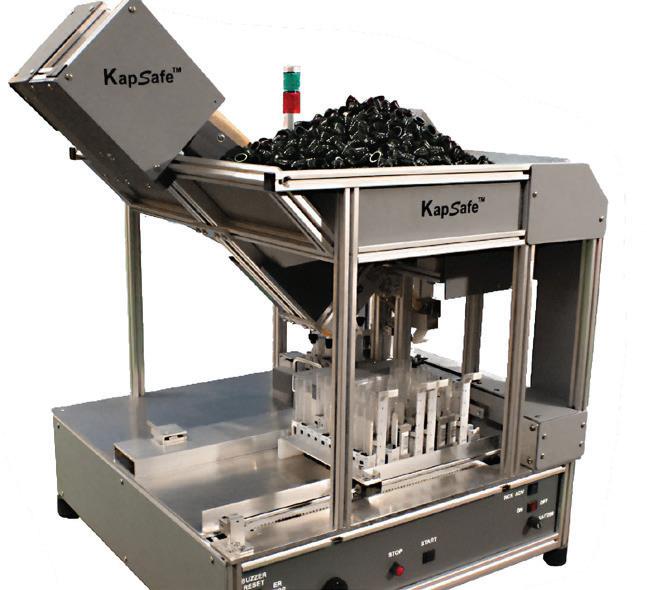 Kap s afe recapper model 3101-1102-L s is a bench top 24” x 24” footprint for the automatic recapping of sample tubes, of various heights/diameters, at a throughput of 700 tubes/ hour. Kap s afe serves to eliminate exposure to repetitive stress injury during manual recapping. uses muti-tier caps to fit various tube diameters. o ther models available.