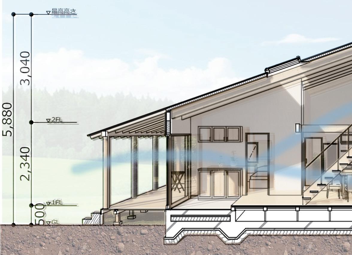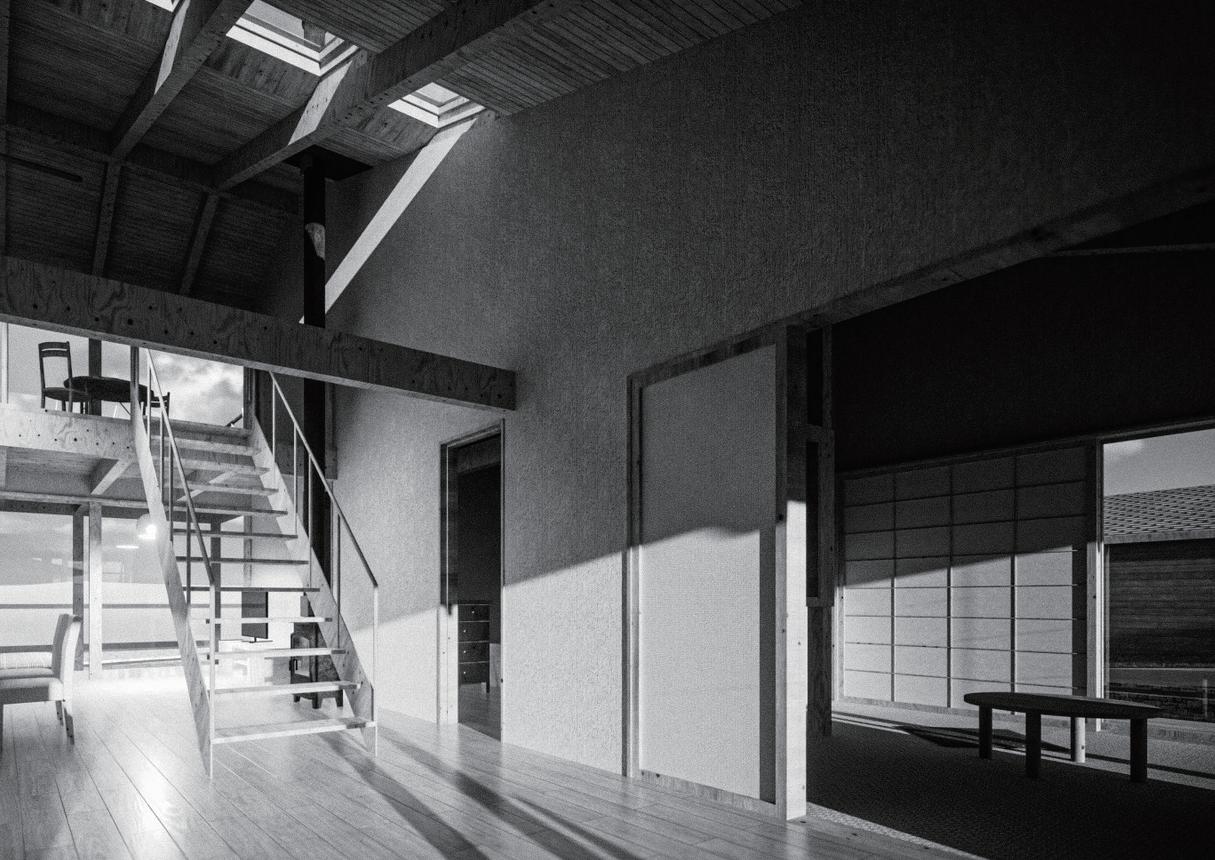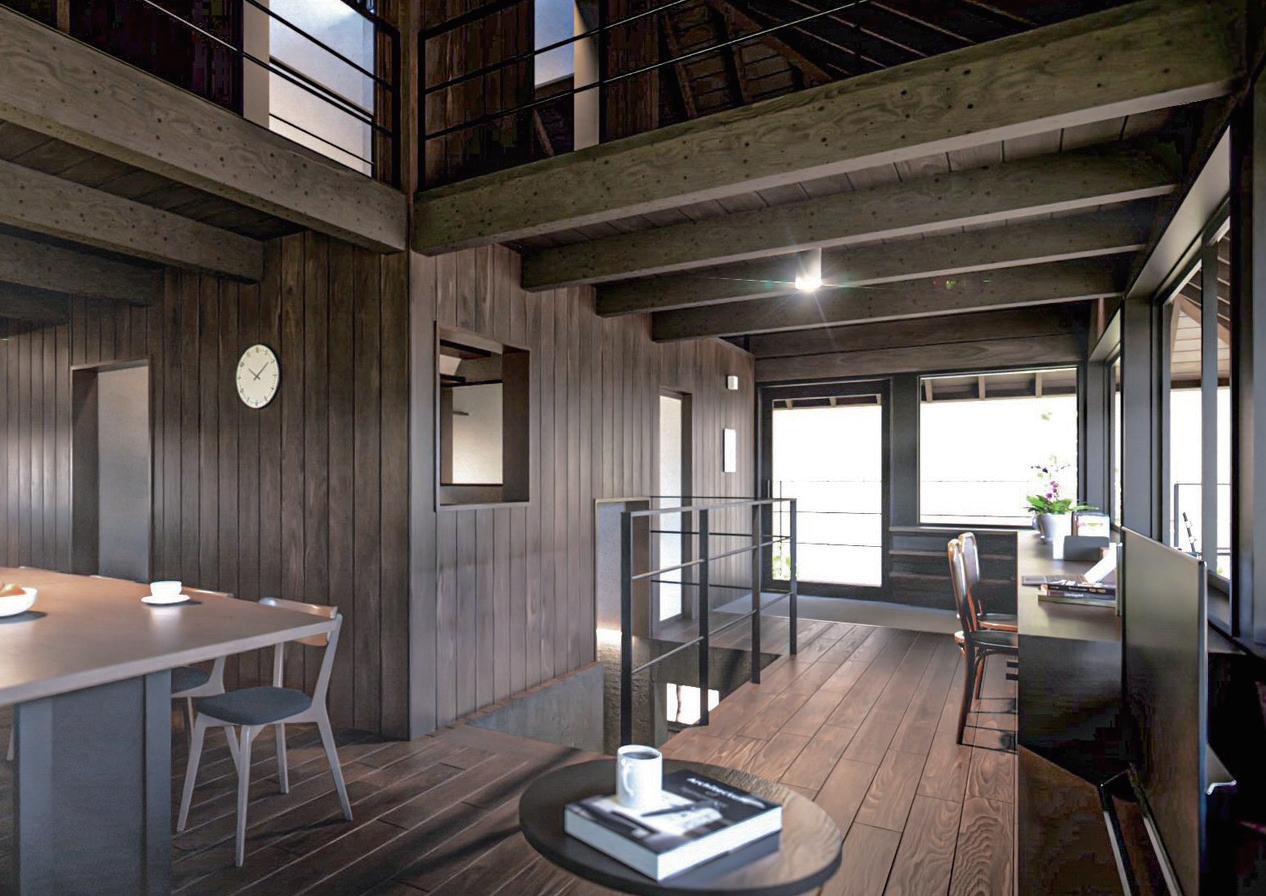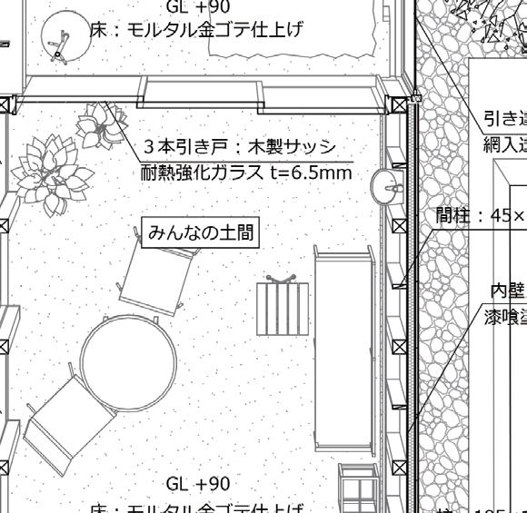 地面のような三和土の床仕上げや小屋組みを露した高い天井や吹き抜けなどの要 素は、現代住宅にも垣間見えます。