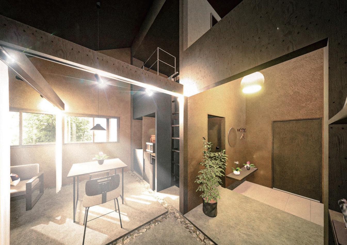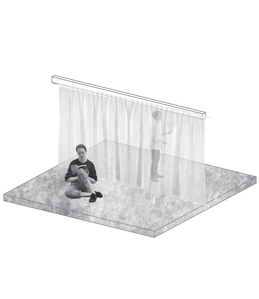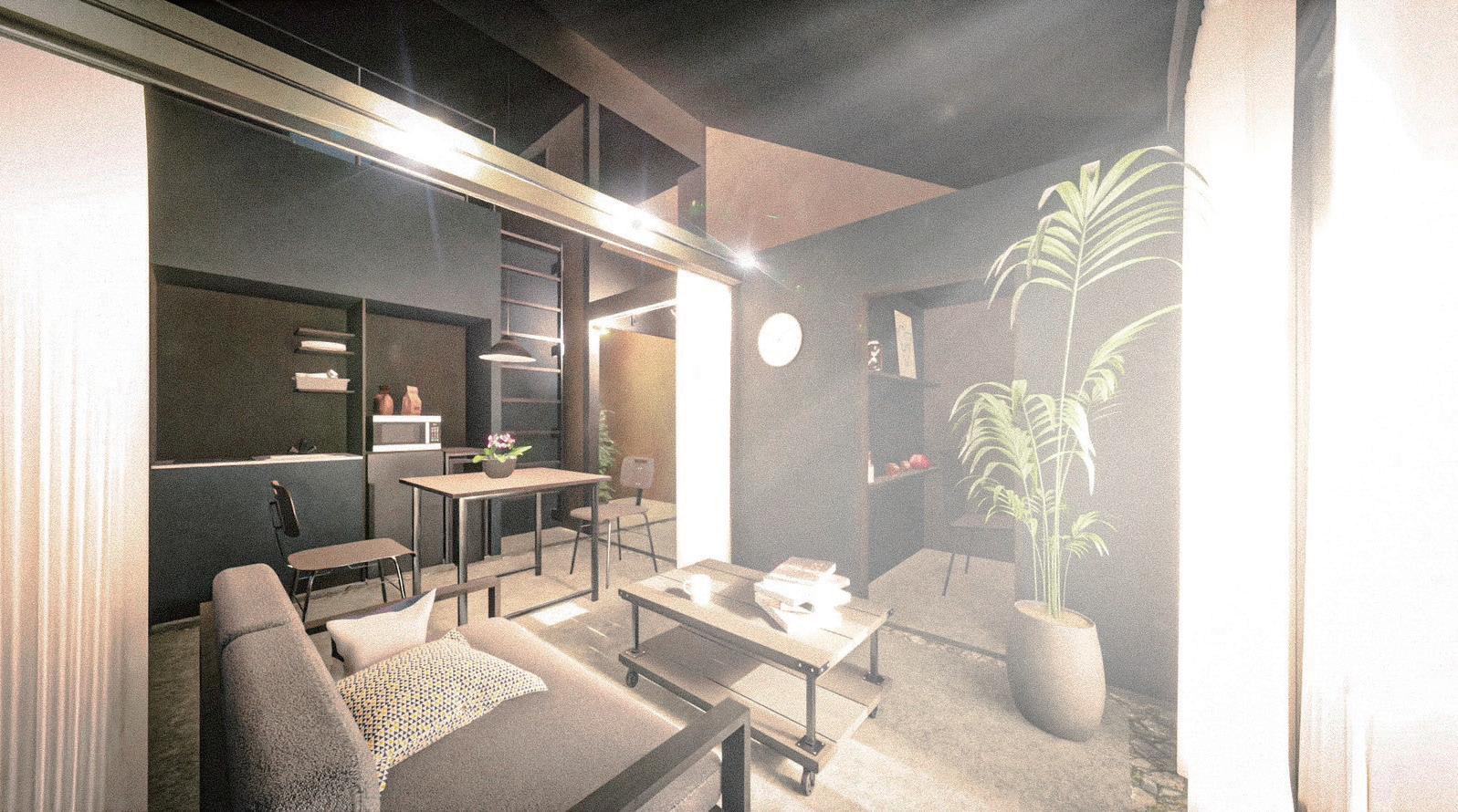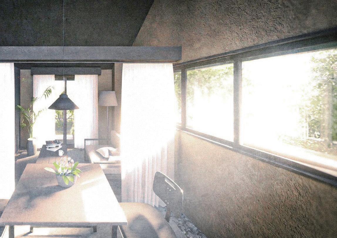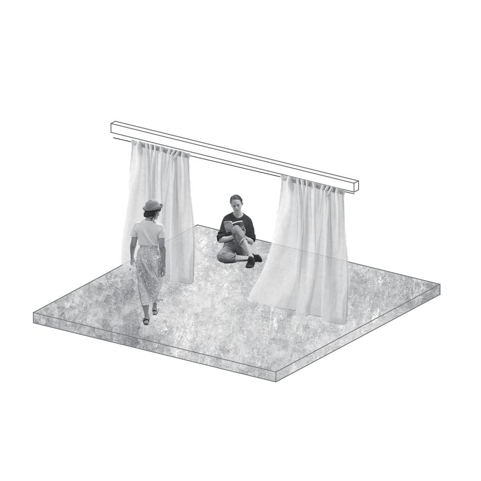 外界の情報と密接に関わっている現代、今一度自分を見つめて自己を確立してい くことが大切であると考えます。本提案では10代後半から20代の情報社会に 疲れ切ってしまい自己を確立したい方をメインターゲットとして、外界を遮断せ ず緩やかにつながった内省する部屋を提案します。独りで滞在したり、心を許し た人と過ごすことで自分と向き合います。